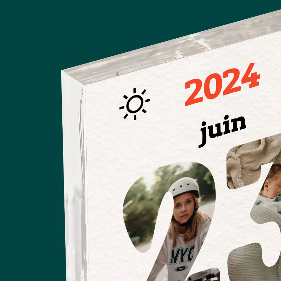 Un imprimé sur un bloc d'acrylique transparent (plexiglas) de 2 cm d'épaisseur avec un motif personnalisé de votre choix.
