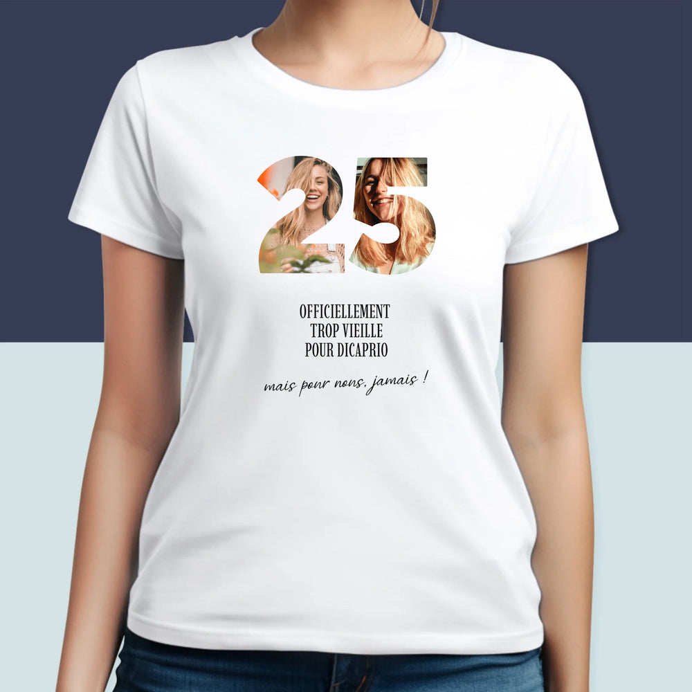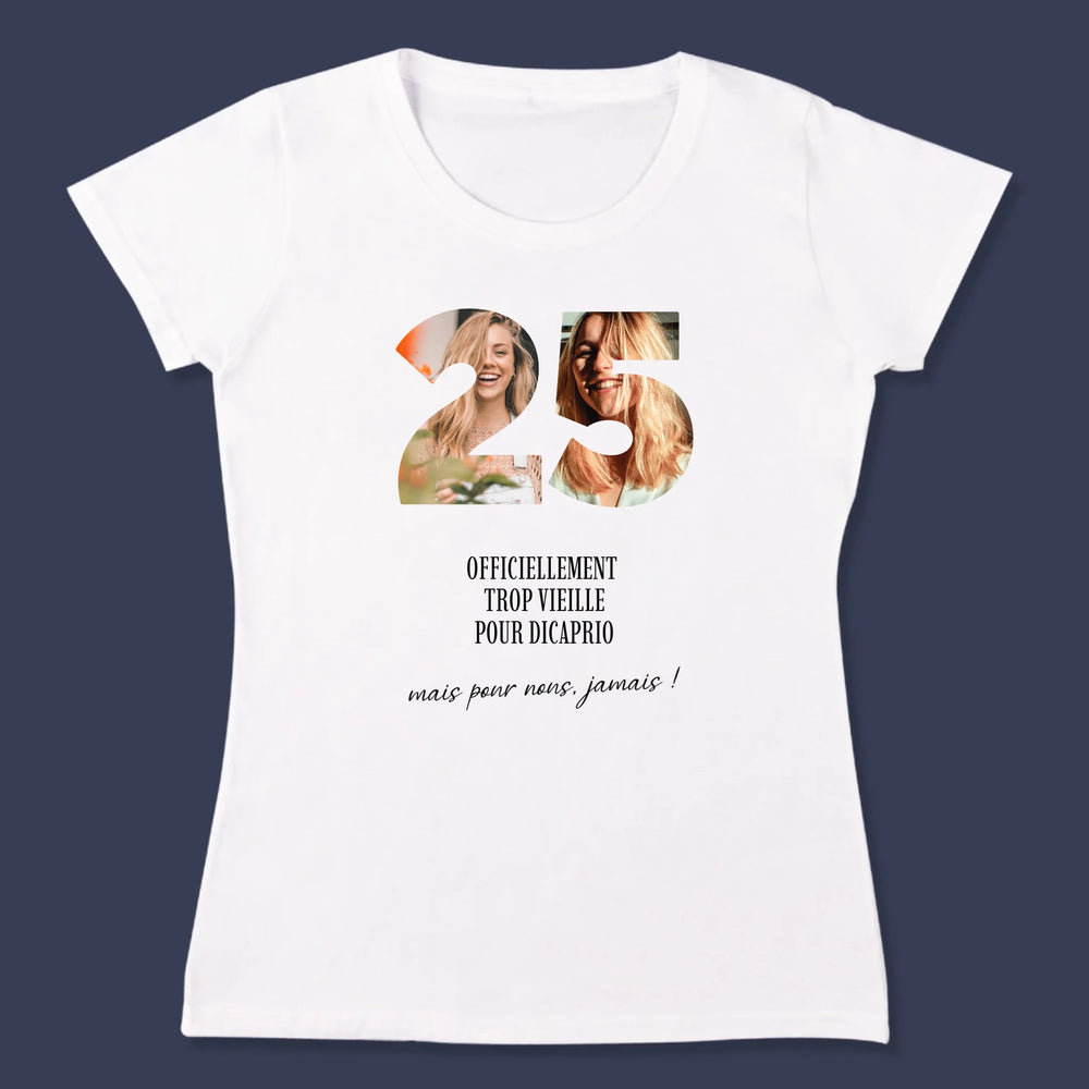 • Un T-shirt blanc pour femme avec la personnalisation de votre choix.