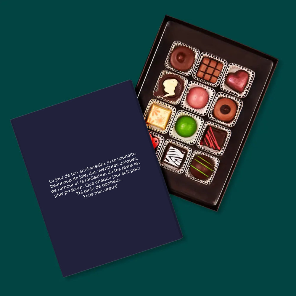 De délicieuses pralines au chocolat belge dans une boîte élégante avec personnalisation de votre choix.
