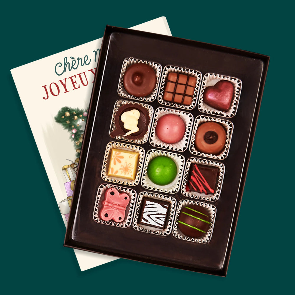 De délicieuses pralines au chocolat belge dans une boîte élégante avec personnalisation de votre choix.
