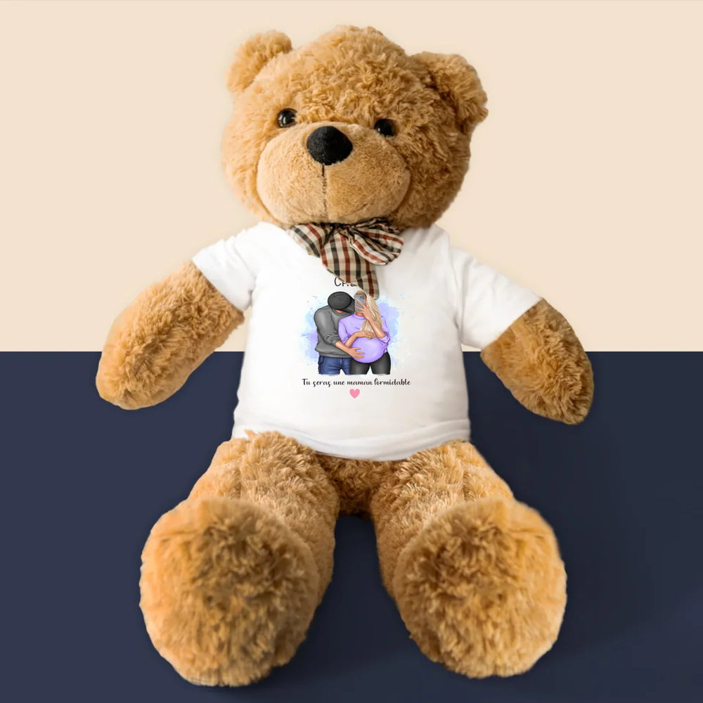 Nous personnalisons votre choix sur le t-shirt que porte l'ours en peluche.