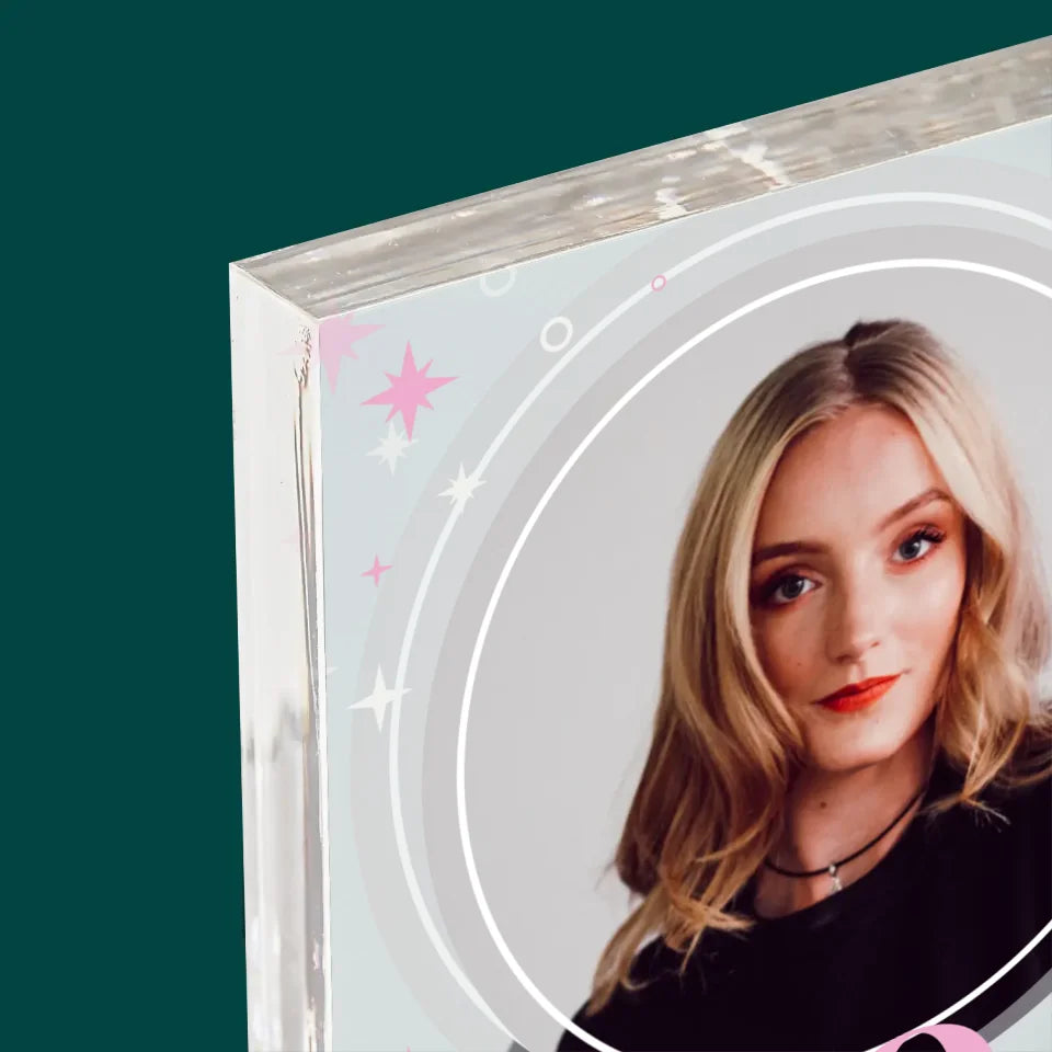 Un imprimé sur un bloc d'acrylique transparent (plexiglas) de 2 cm d'épaisseur avec un motif personnalisé de votre choix.