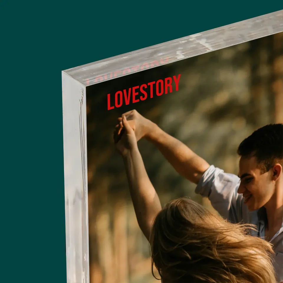 Un imprimé sur un bloc d'acrylique transparent (plexiglas) de 2 cm d'épaisseur avec un motif personnalisé de votre choix.
