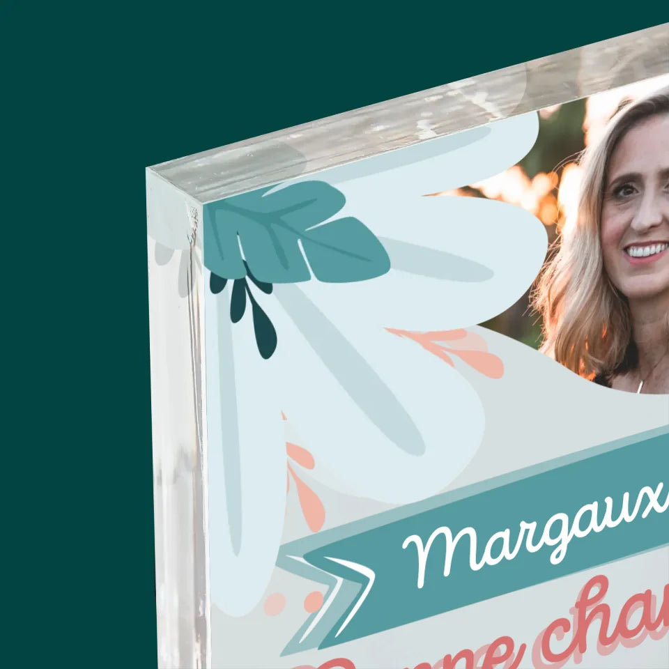 • Un imprimé sur un bloc d'acrylique transparent (plexiglas) de 2 cm d'épaisseur avec un motif personnalisé de votre choix.