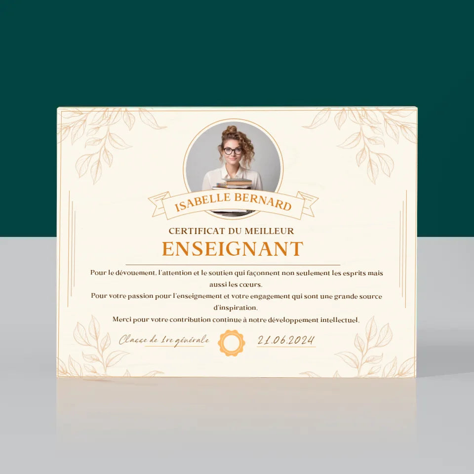 Photo Et Texte: Certificat Du Meilleur Enseignant - Impression sur bois - horizontal