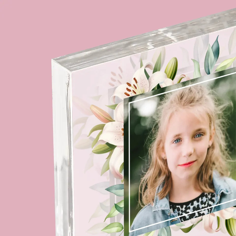 Un imprimé sur un bloc d'acrylique transparent (plexiglas) de 2 cm d'épaisseur avec un motif personnalisé de votre choix.