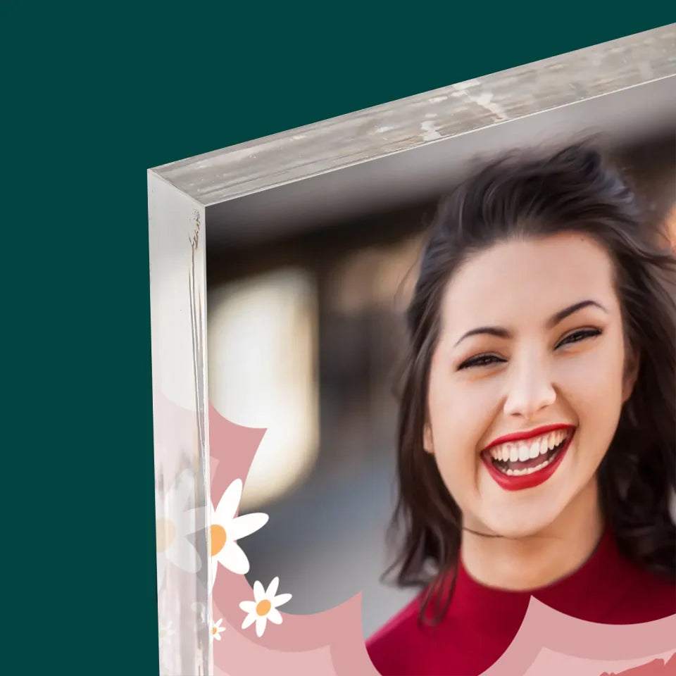 Un imprimé sur un bloc d'acrylique transparent (plexiglas) de 2 cm d'épaisseur avec un motif personnalisé de votre choix.
