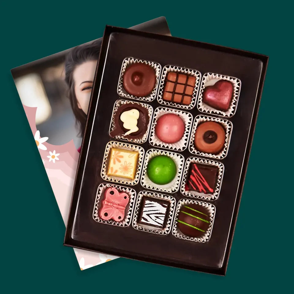De délicieuses pralines au chocolat belge dans une boîte élégante avec personnalisation de votre choix.