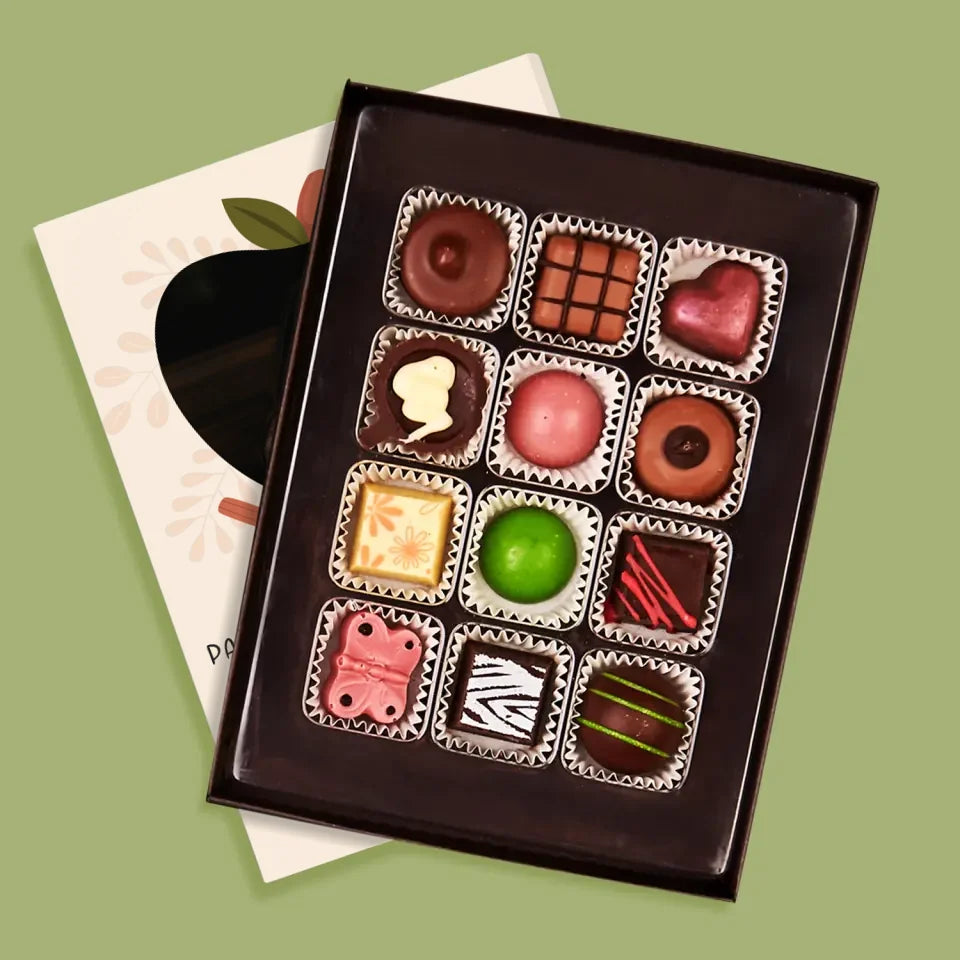 De délicieuses pralines au chocolat belge dans une boîte élégante avec personnalisation de votre choix.