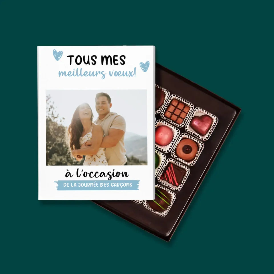 De délicieuses pralines au chocolat belge dans une boîte élégante avec personnalisation de votre choix.