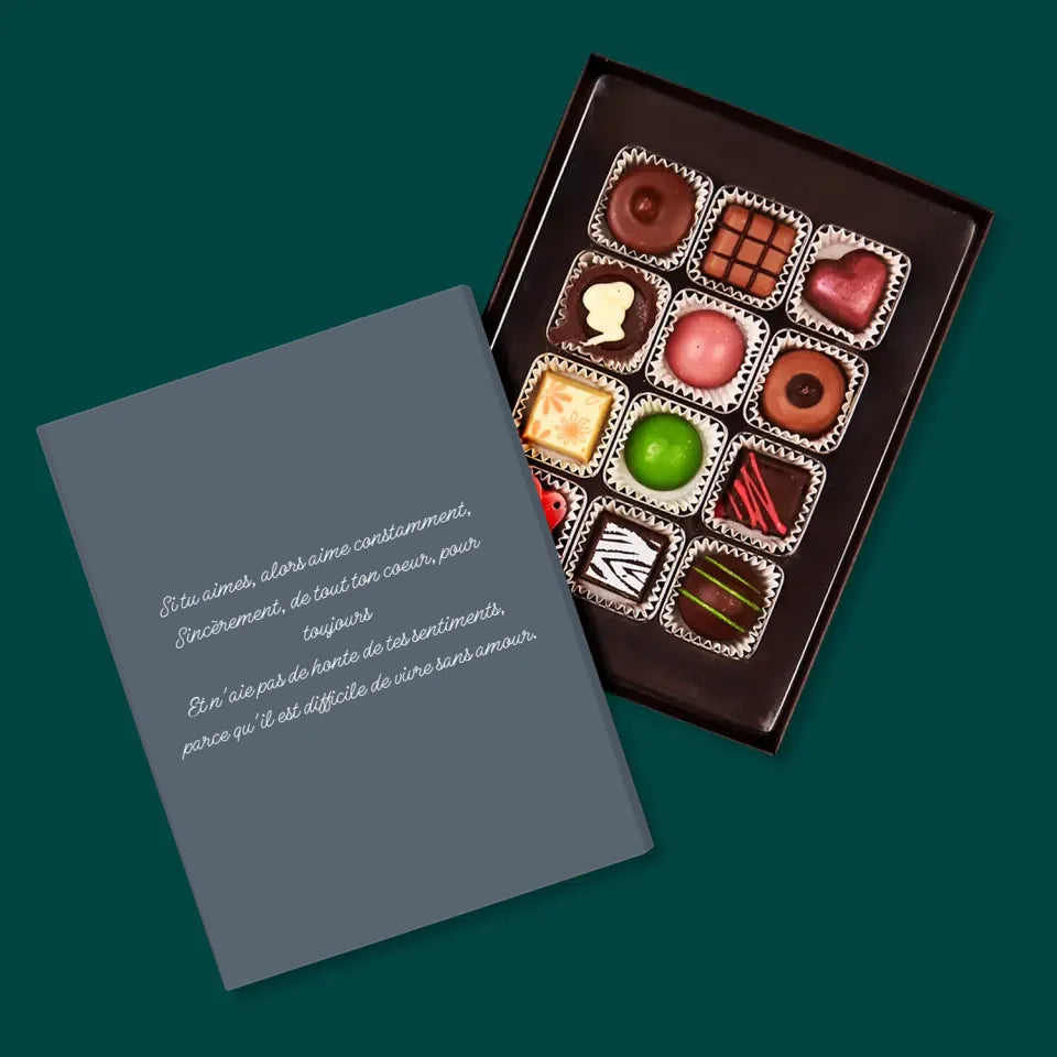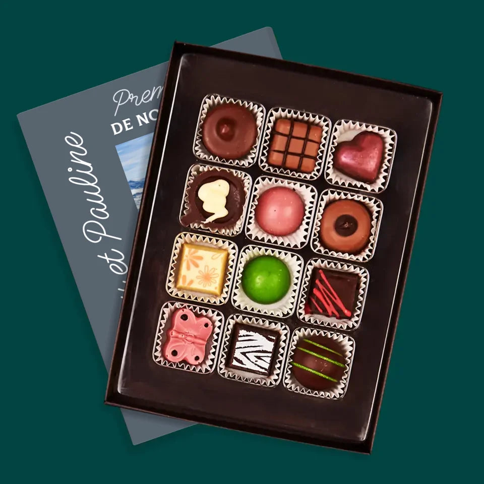 De délicieuses pralines au chocolat belge dans une boîte élégante avec personnalisation de votre choix.
