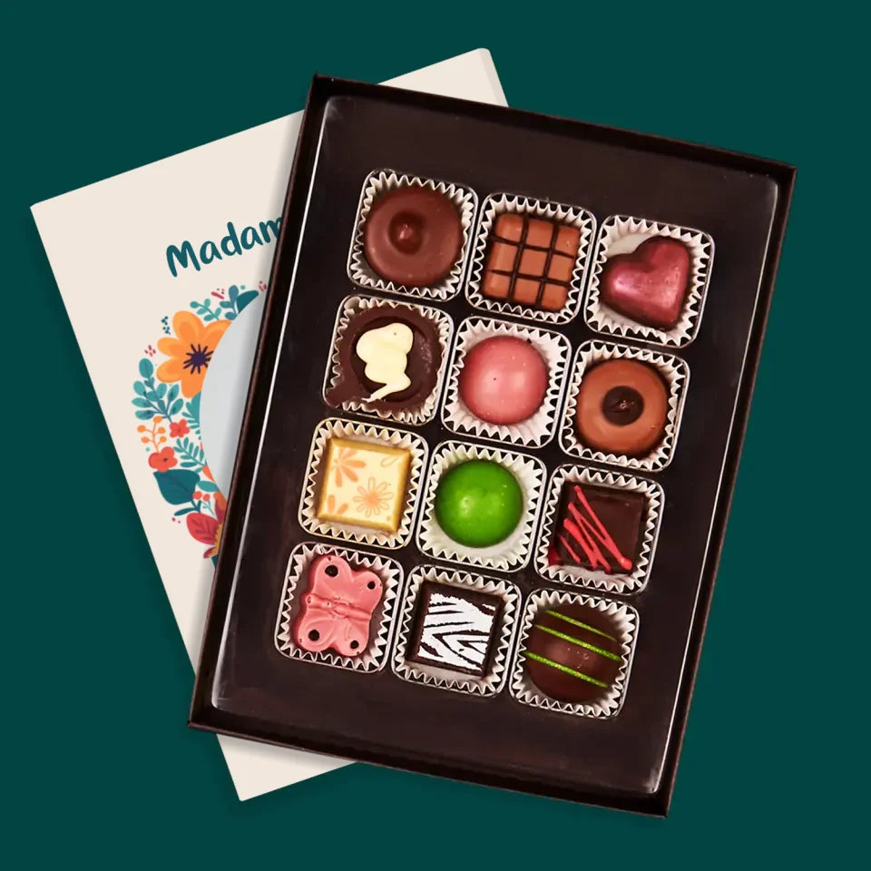 De délicieuses pralines au chocolat belge dans une boîte élégante avec personnalisation de votre choix.