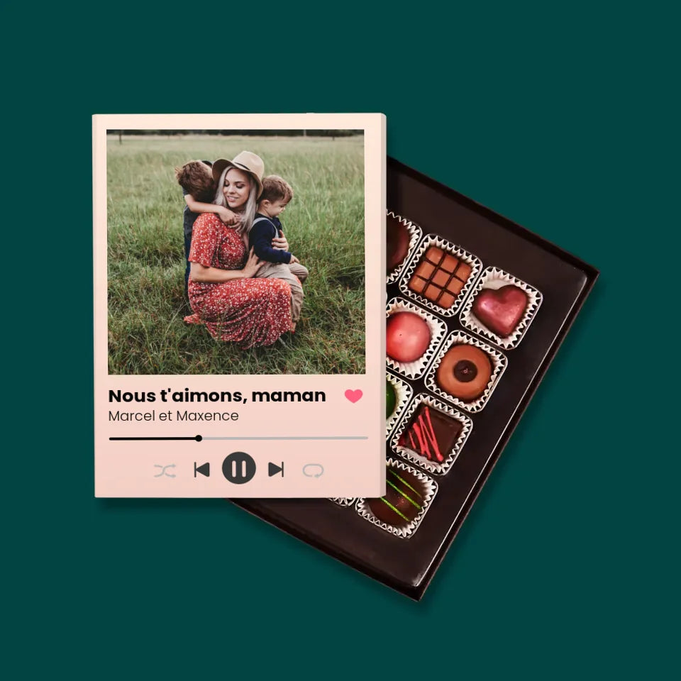 De délicieuses pralines au chocolat belge dans une boîte élégante avec personnalisation de votre choix.