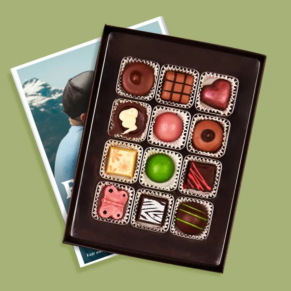 De délicieuses pralines au chocolat belge dans une boîte élégante avec personnalisation de votre choix.