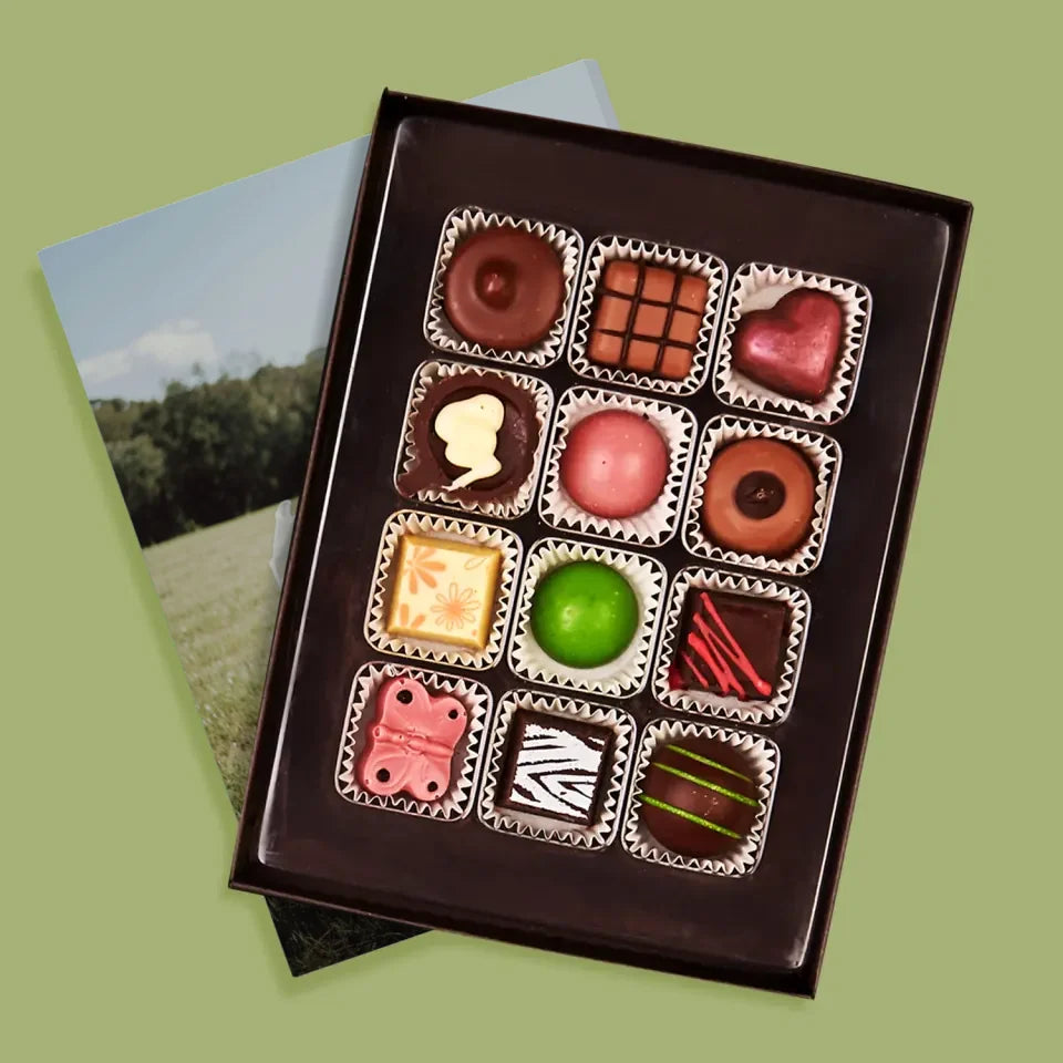 De délicieuses pralines au chocolat belge dans une boîte élégante avec personnalisation de votre choix.