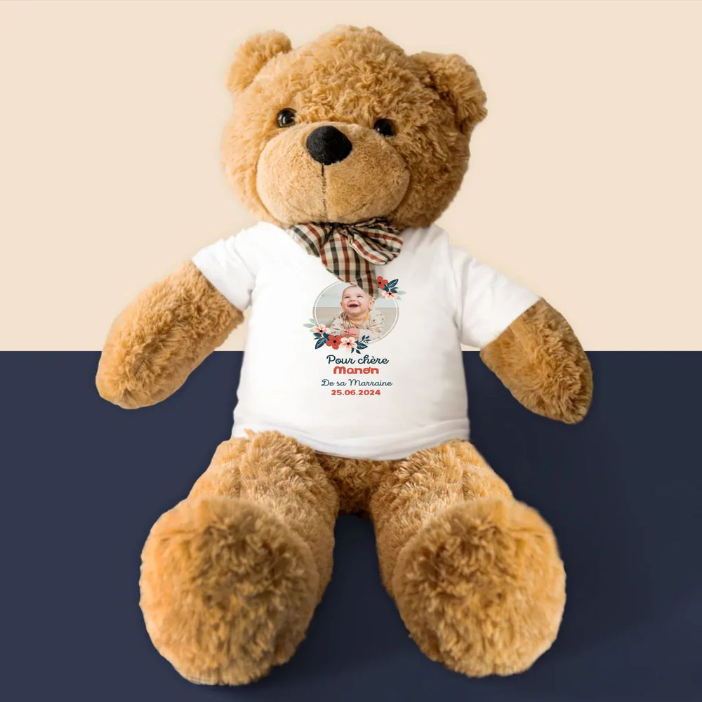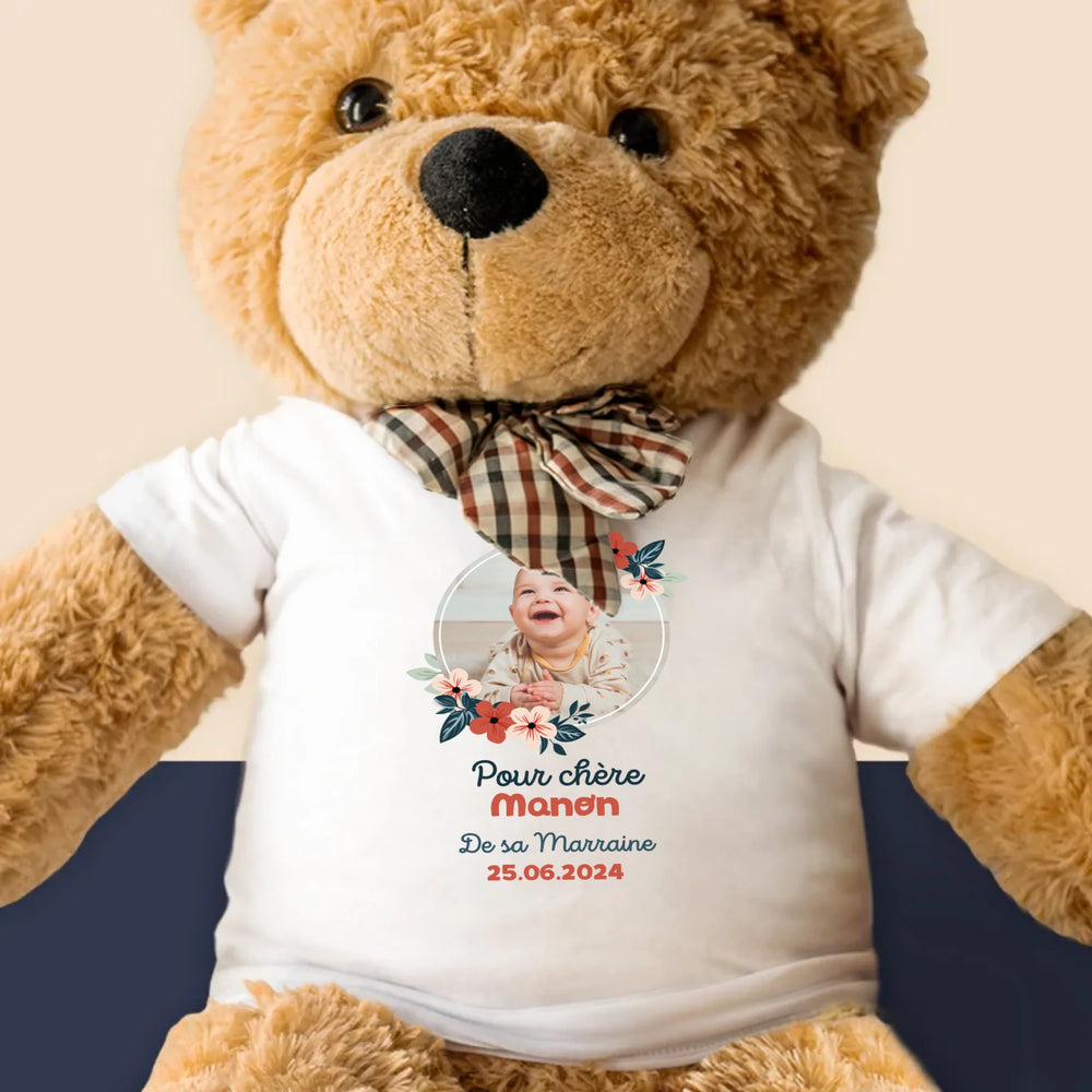 Nous personnalisons votre choix sur le t-shirt que porte l'ours en peluche.