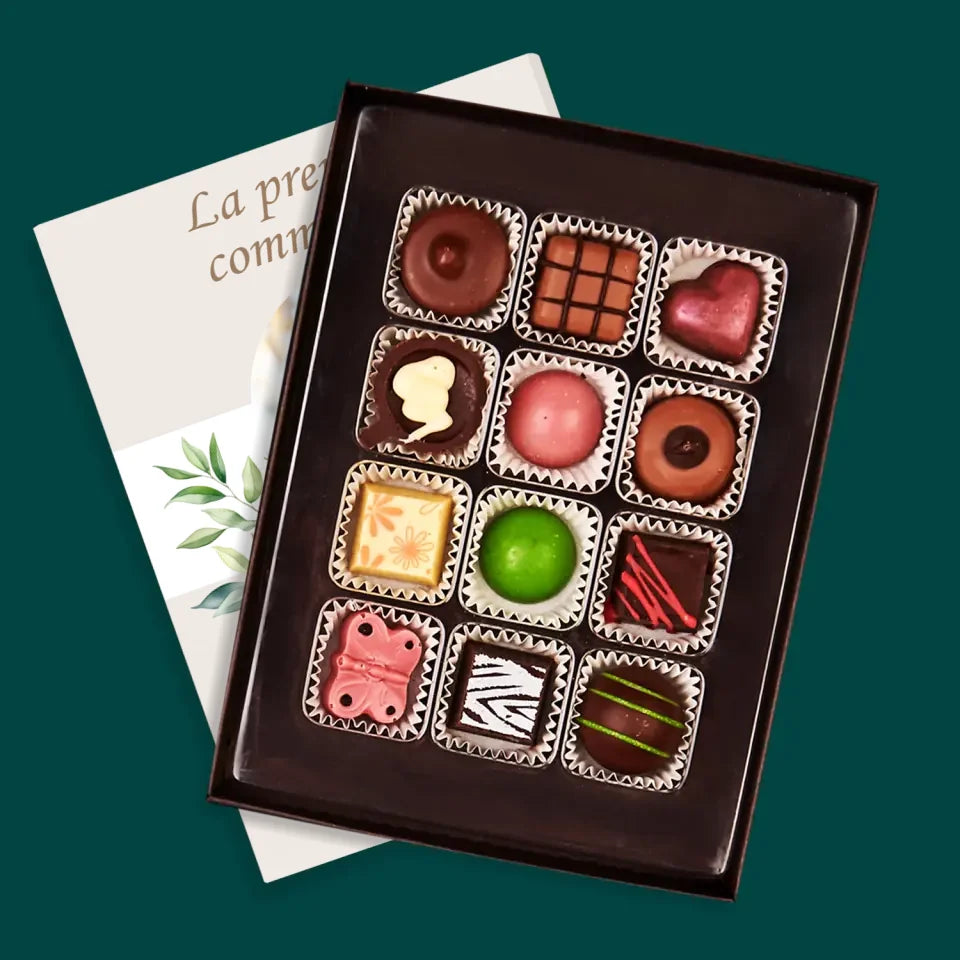 De délicieuses pralines au chocolat belge dans une boîte élégante avec personnalisation de votre choix.