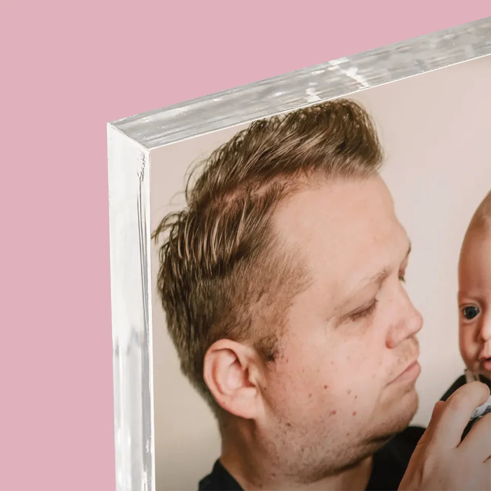 Un imprimé sur un bloc d'acrylique transparent (plexiglas) de 2 cm d'épaisseur avec un motif personnalisé de votre choix.