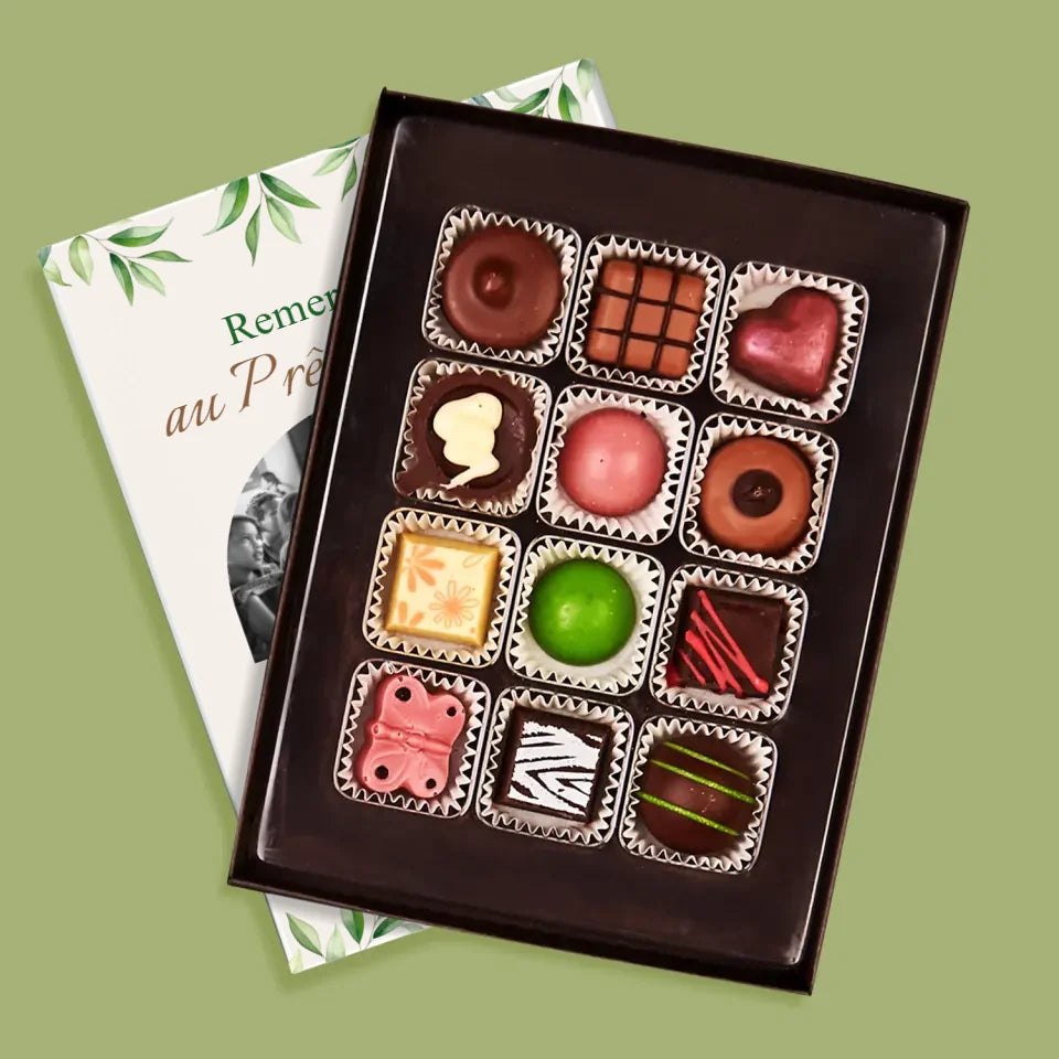 De délicieuses pralines au chocolat belge dans une boîte élégante avec personnalisation de votre choix.
