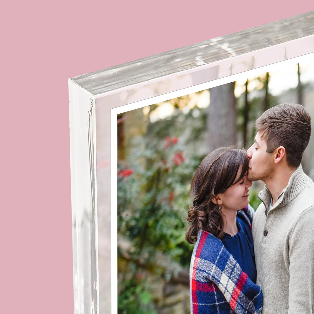 Un imprimé sur un bloc d'acrylique transparent (plexiglas) de 2 cm d'épaisseur avec un motif personnalisé de votre choix.