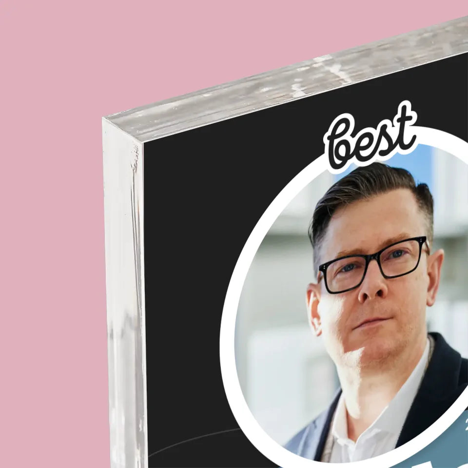 Un imprimé sur un bloc d'acrylique transparent (plexiglas) de 2 cm d'épaisseur avec un motif personnalisé de votre choix.