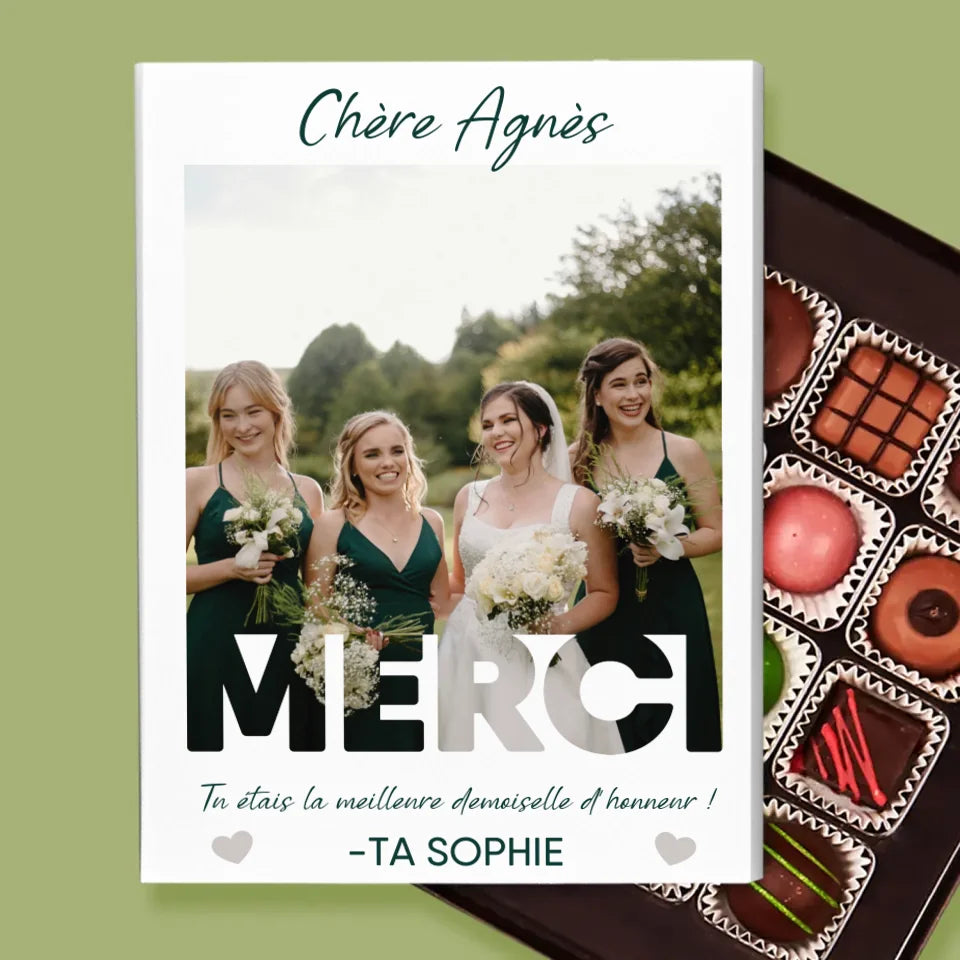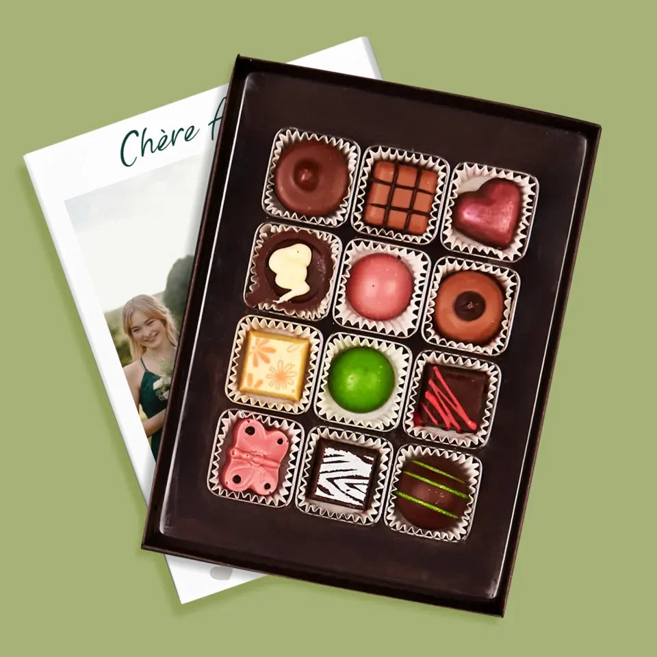 De délicieuses pralines au chocolat belge dans une boîte élégante avec personnalisation de votre choix.