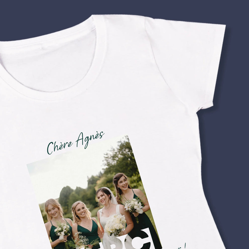 Un T-shirt blanc pour femme avec la personnalisation de votre choix.