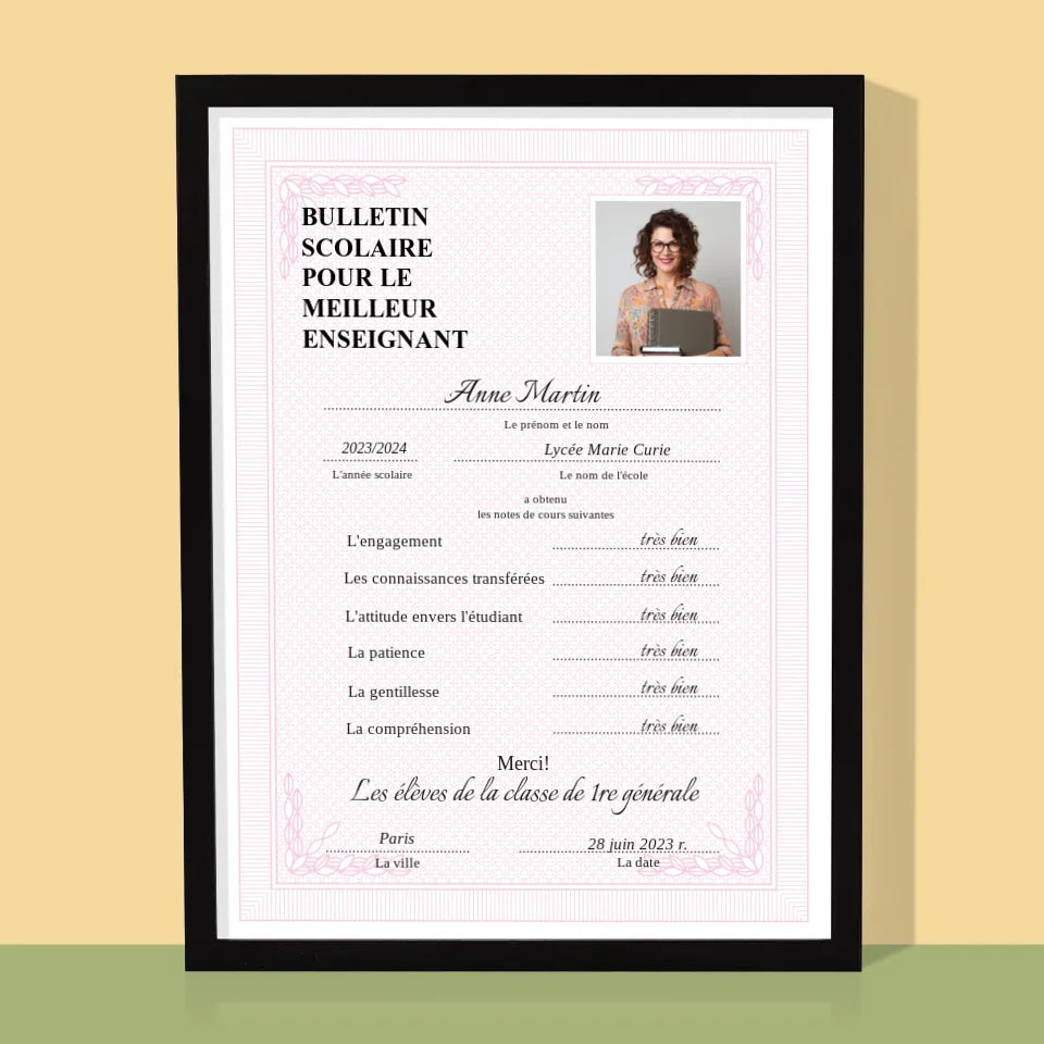 Photo Et Texte: Bulletin Scolaire Pour Le Meilleur Enseignant - Impression encadrée - Vertical