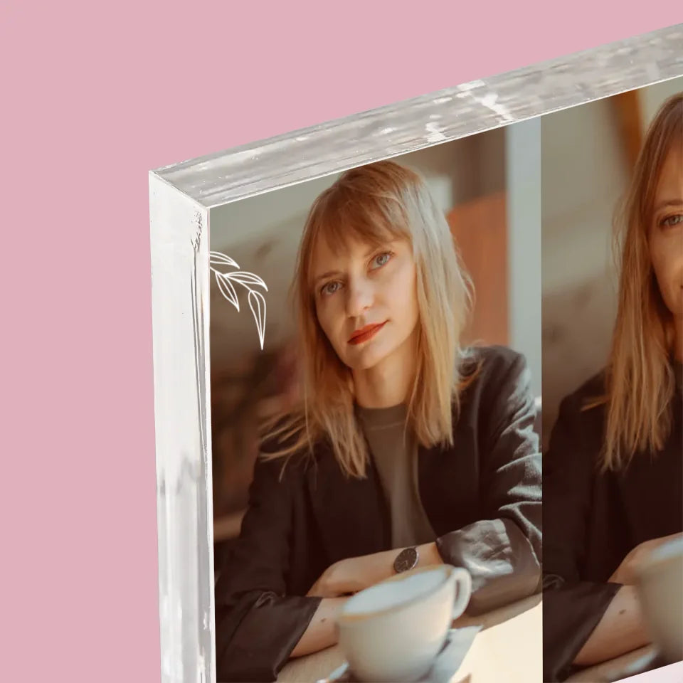 Un imprimé sur un bloc d'acrylique transparent (plexiglas) de 2 cm d'épaisseur avec un motif personnalisé de votre choix.