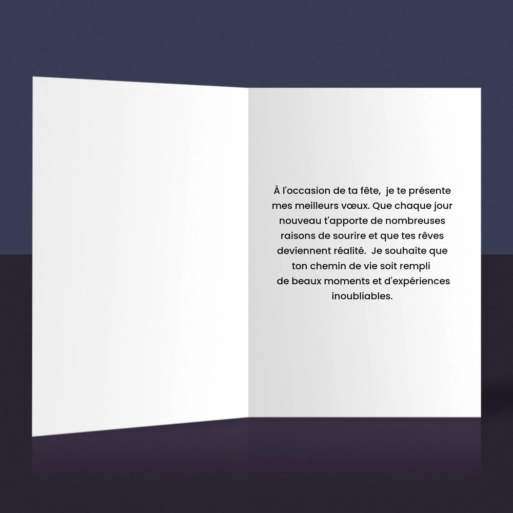 Dimensions de la carte pliée : standard : 13 x 18 cm, version XL : 21 x 29,5 cm.