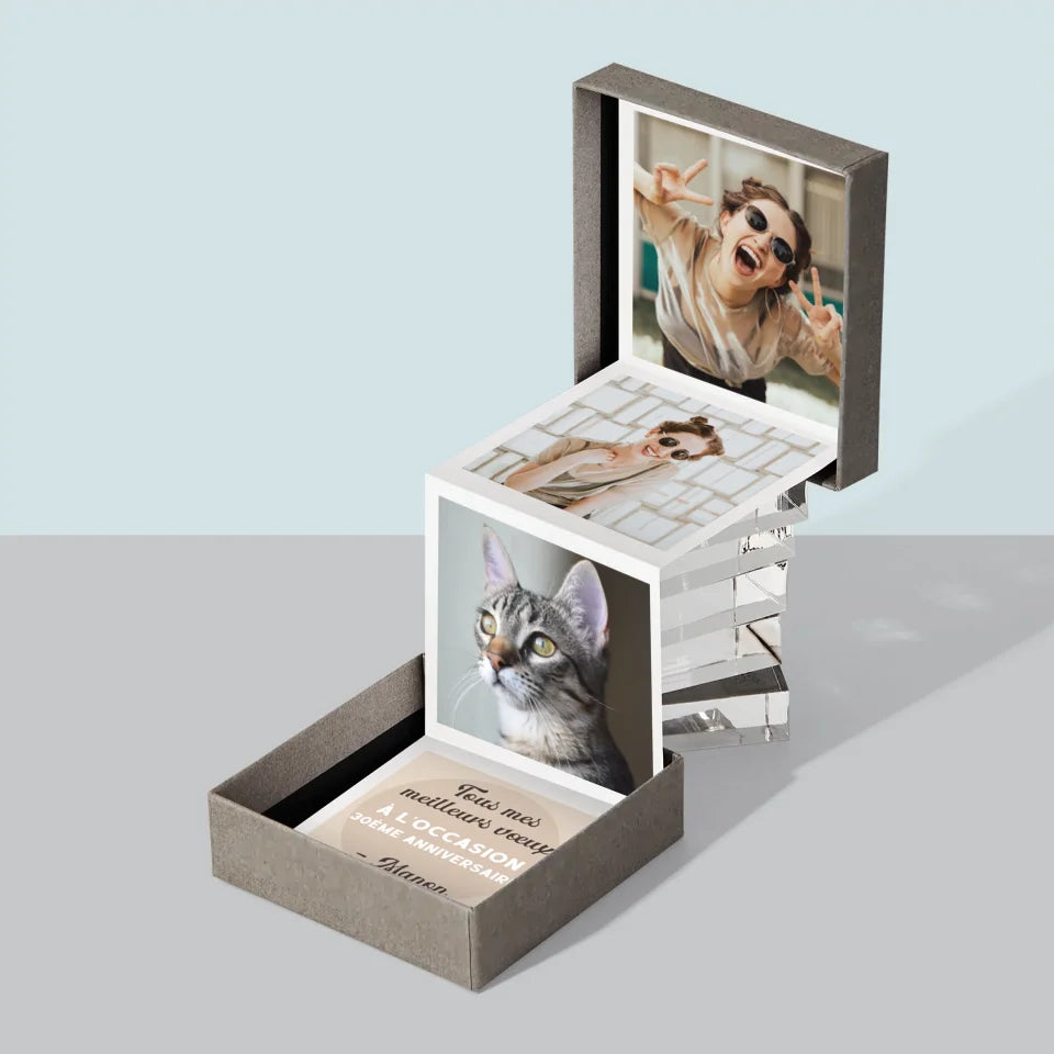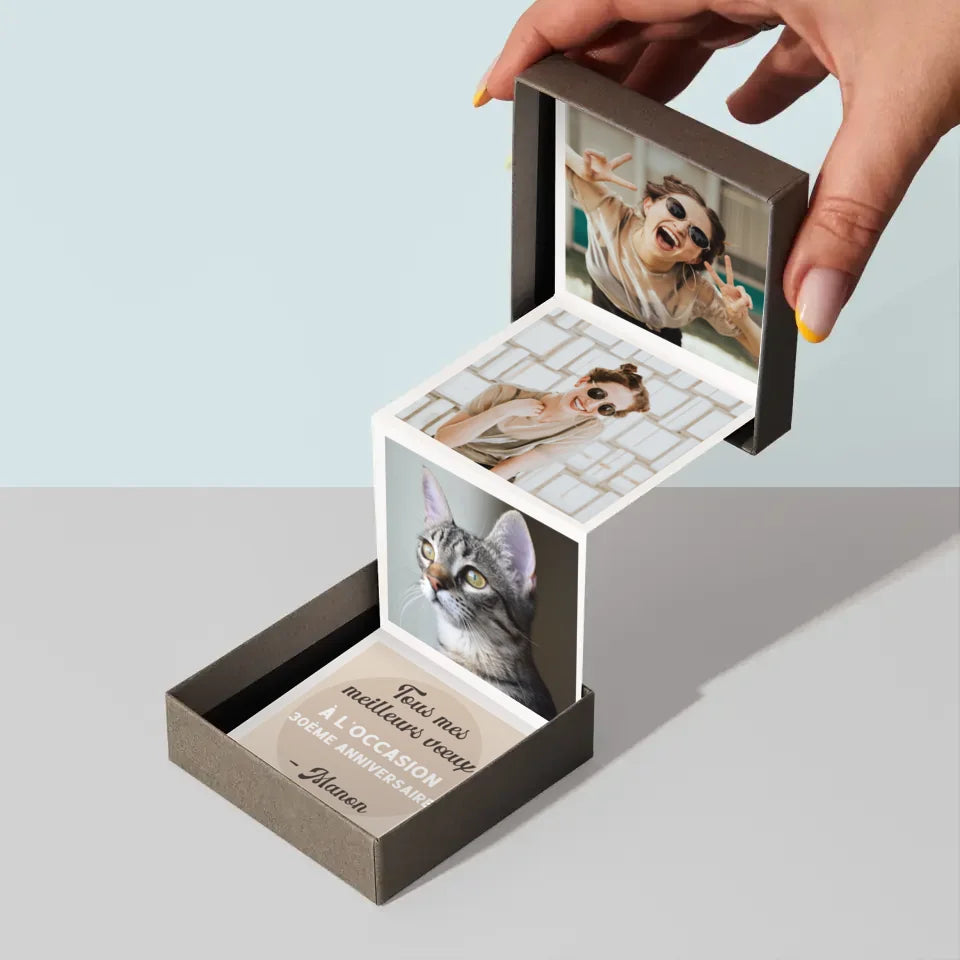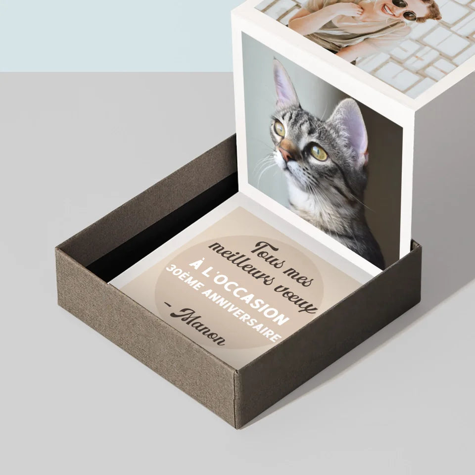 • Le complet se compose de trois photos mesurant 6,68 x 6,68 cm et d'une carte personnalisée avec une dédicace au destinataire.