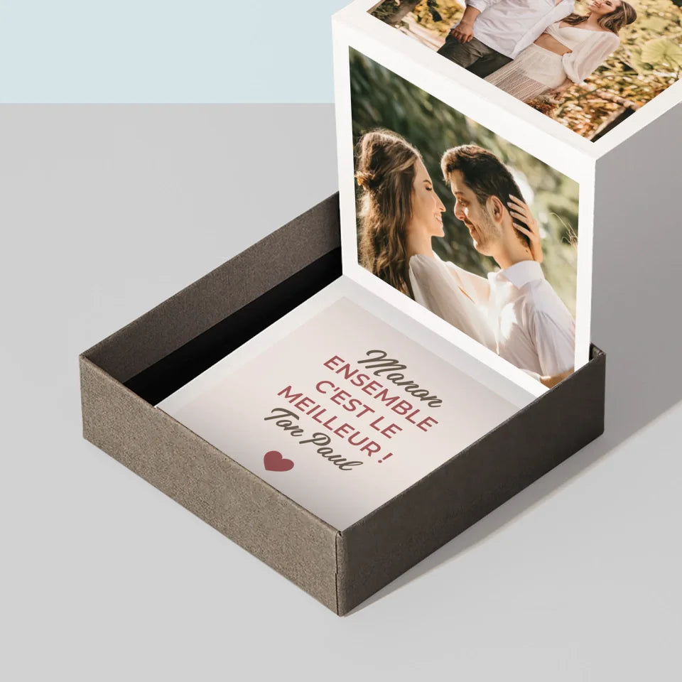 Le complet se compose de trois photos mesurant 6,68 x 6,68 cm et d'une carte personnalisée avec une dédicace au destinataire.