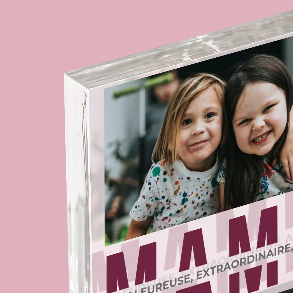 Un imprimé sur un bloc d'acrylique transparent (plexiglas) de 2 cm d'épaisseur avec un motif personnalisé de votre choix.