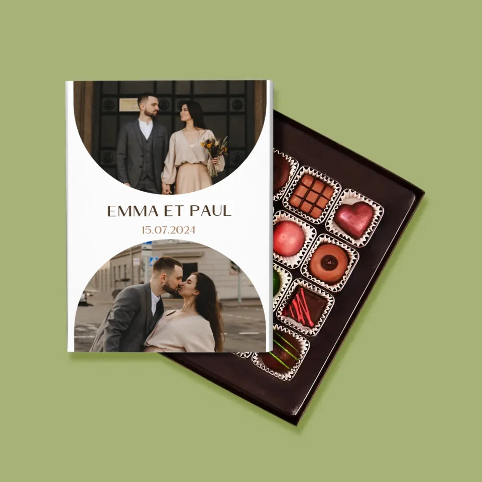 De délicieuses pralines au chocolat belge dans une boîte élégante avec personnalisation de votre choix.