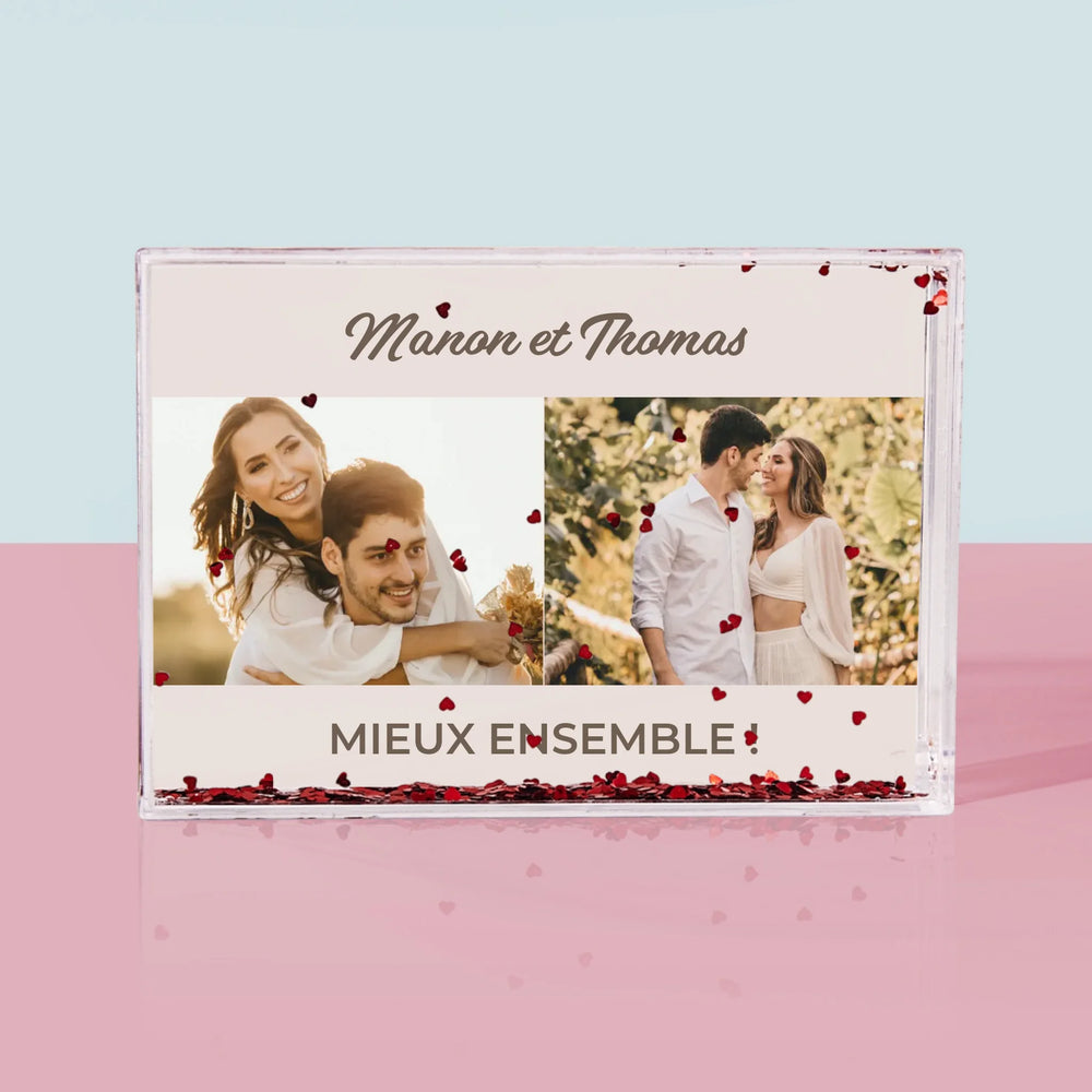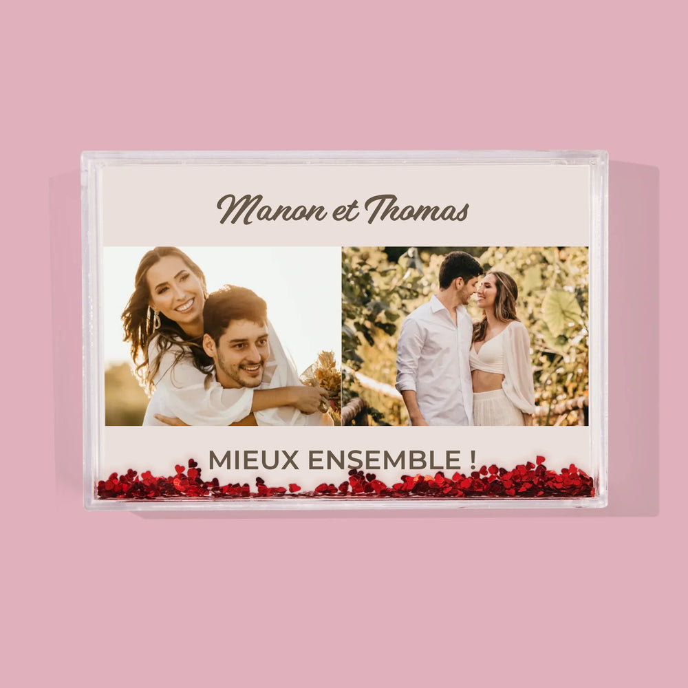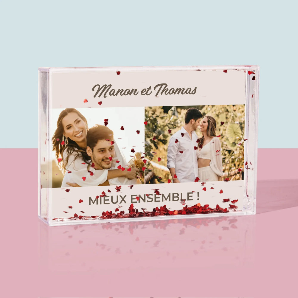 Fabriqué en plastique transparent, l'intérieur est rempli d'eau et de confettis en forme de cœur !