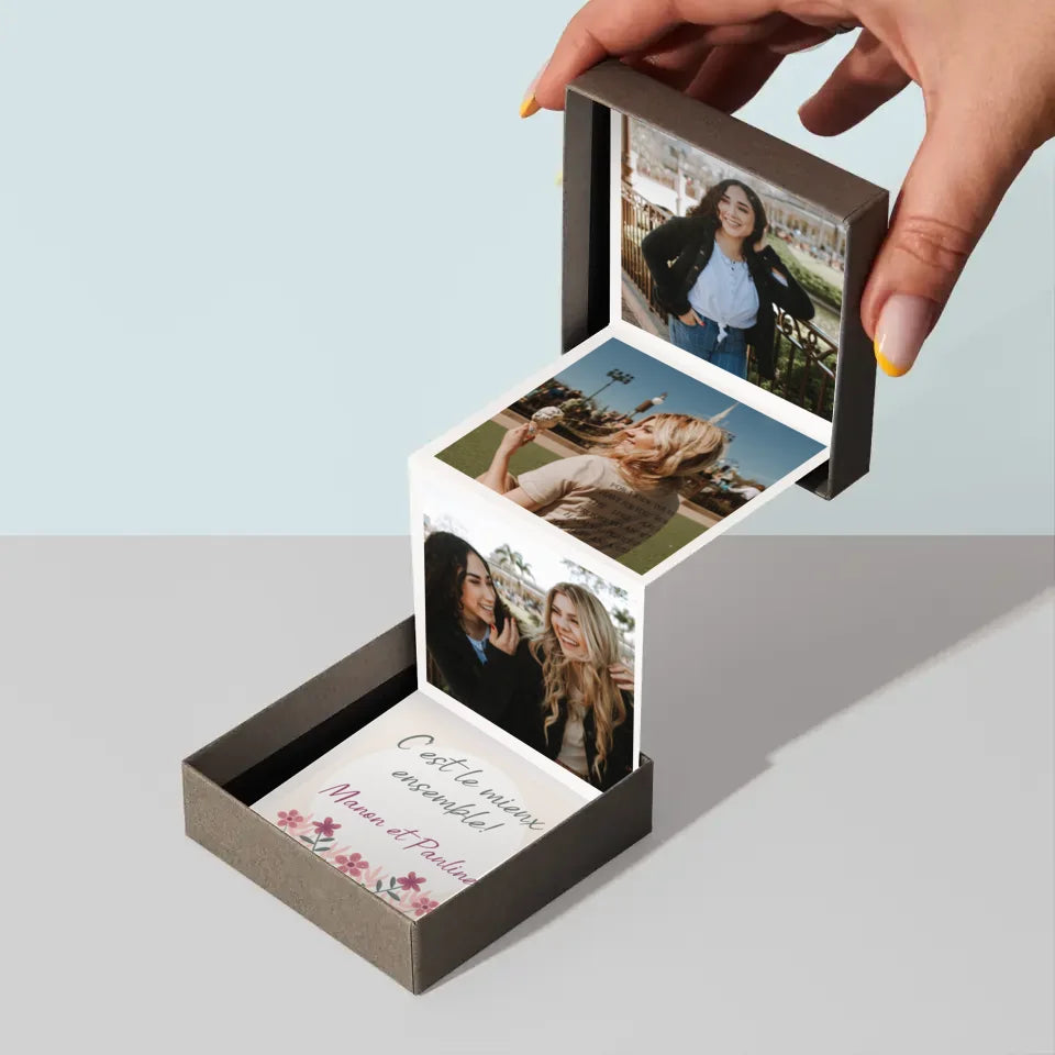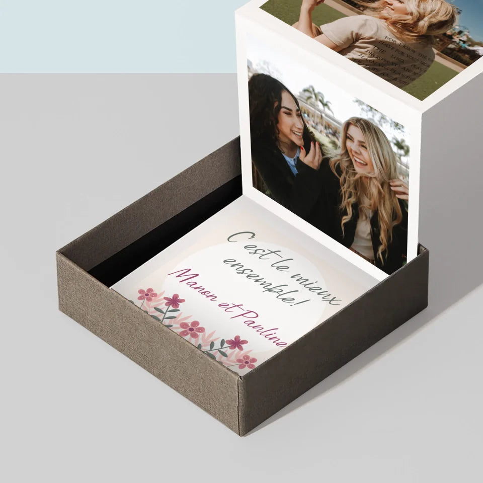 Le complet se compose de trois photos mesurant 6,68 x 6,68 cm et d'une carte personnalisée avec une dédicace au destinataire.