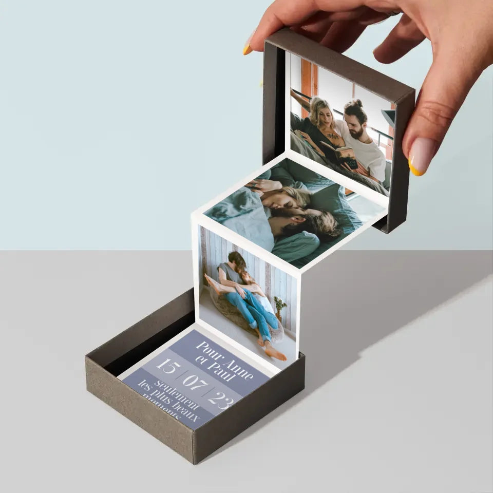 Le complet se compose de trois photos mesurant 6,68 x 6,68 cm et d'une carte personnalisée avec une dédicace au destinataire.