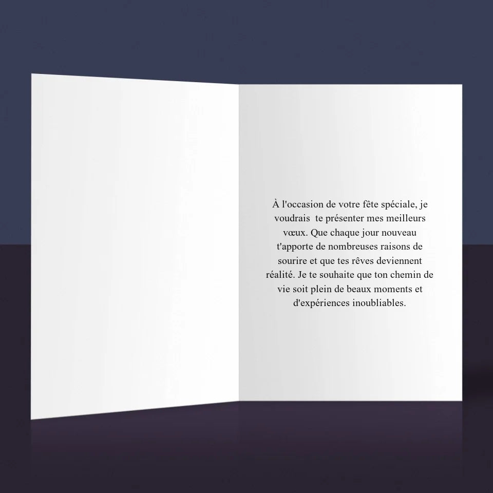 Dimensions de la carte pliée : standard : 13 x 18 cm, version XL : 21 x 29,5 cm.