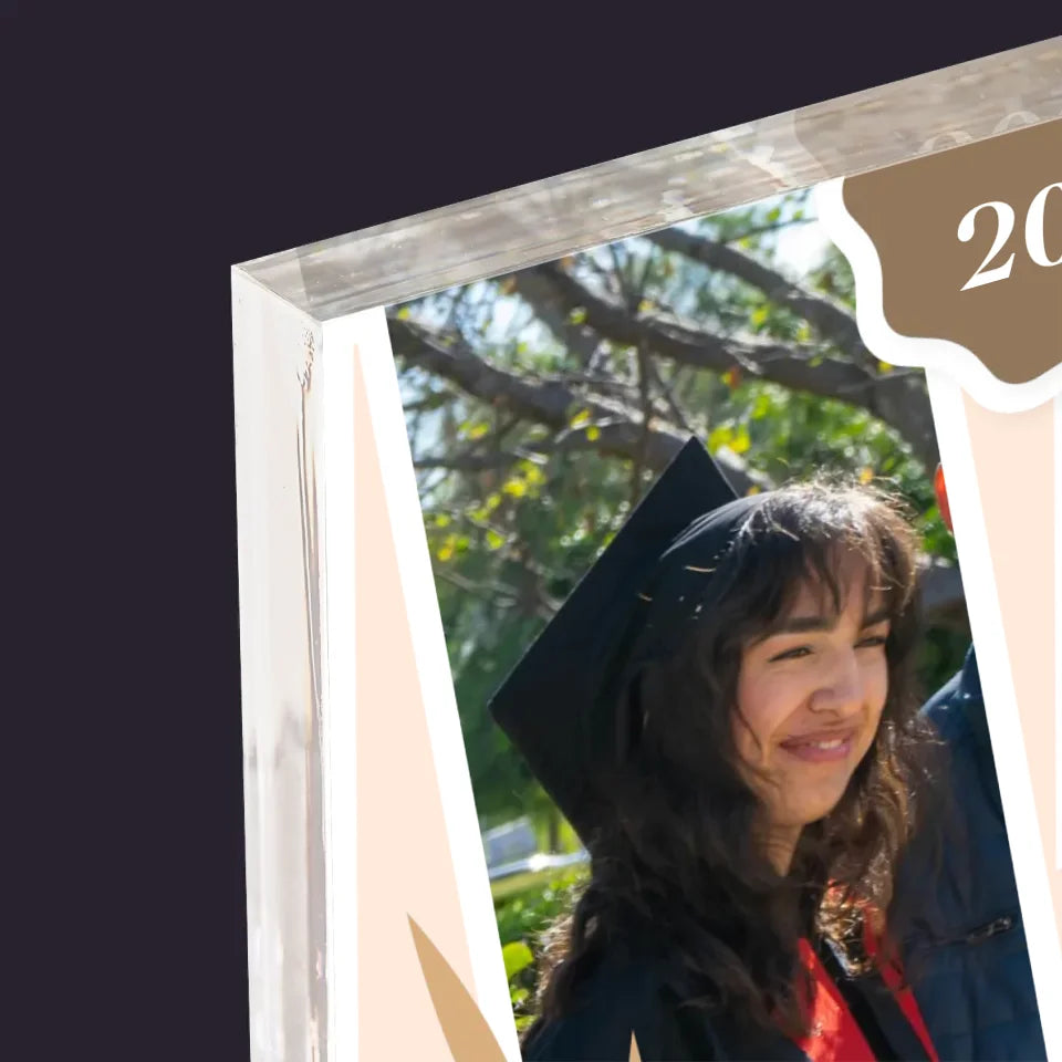 Un imprimé sur un bloc d'acrylique transparent (plexiglas) de 2 cm d'épaisseur avec un motif personnalisé de votre choix.