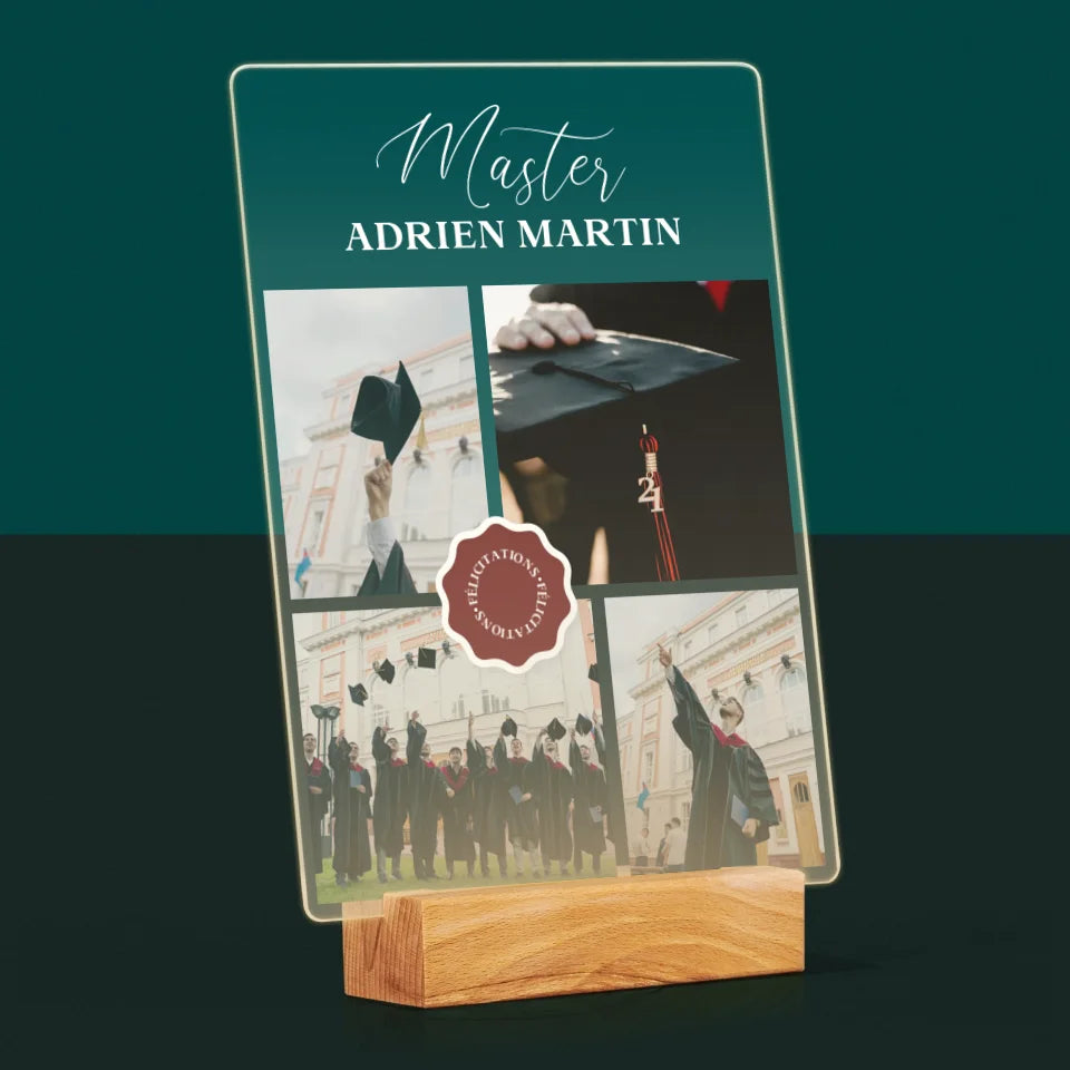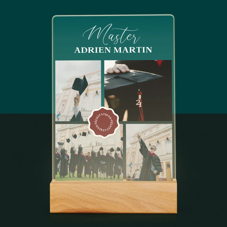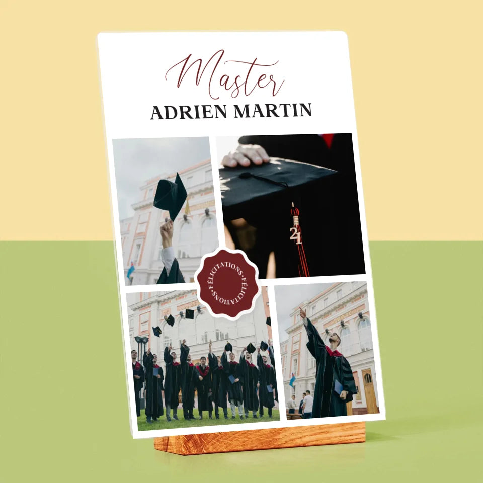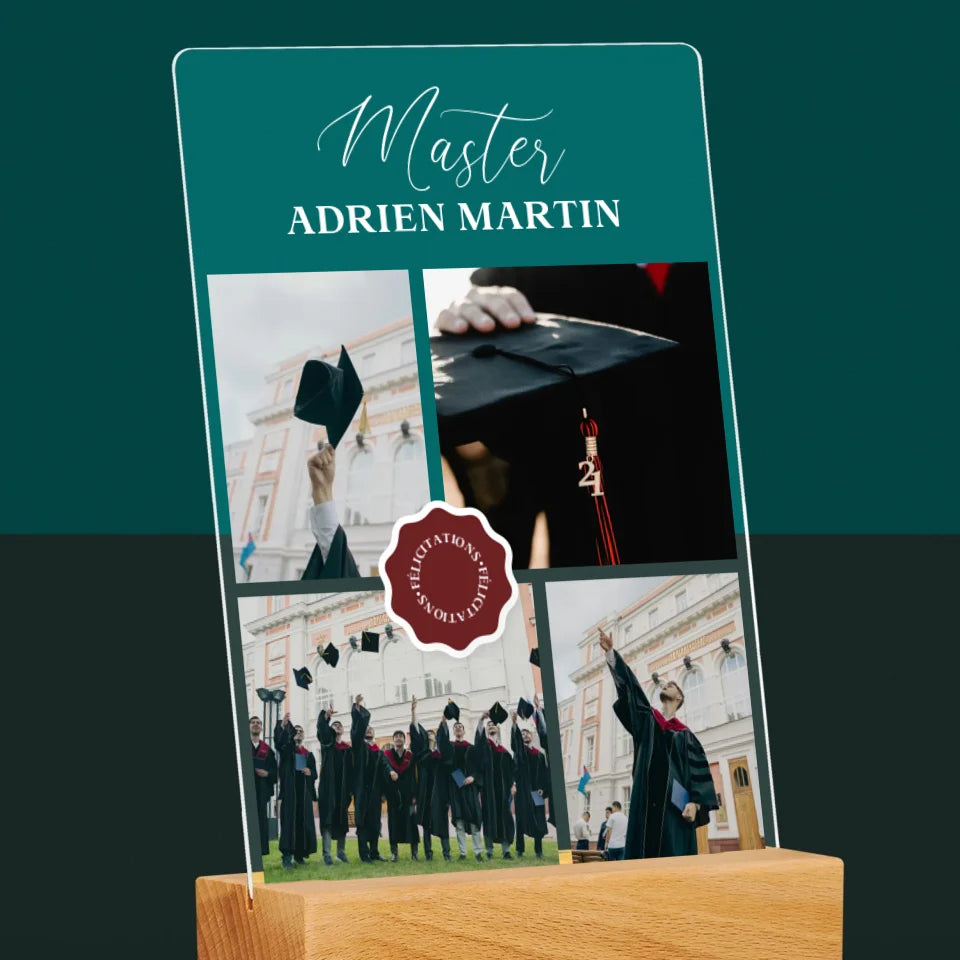 Dimensions du verre A4 : 29,5 x 22 cm, dimensions du support en bois : 15 x 4,5 cm