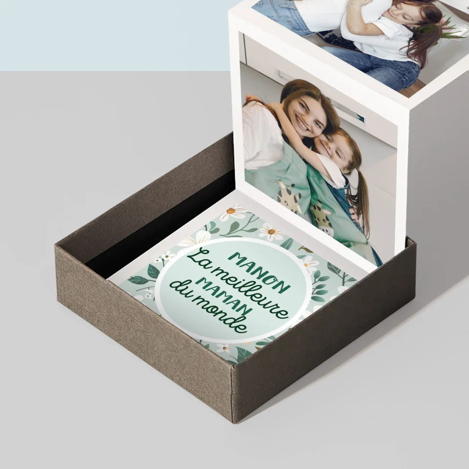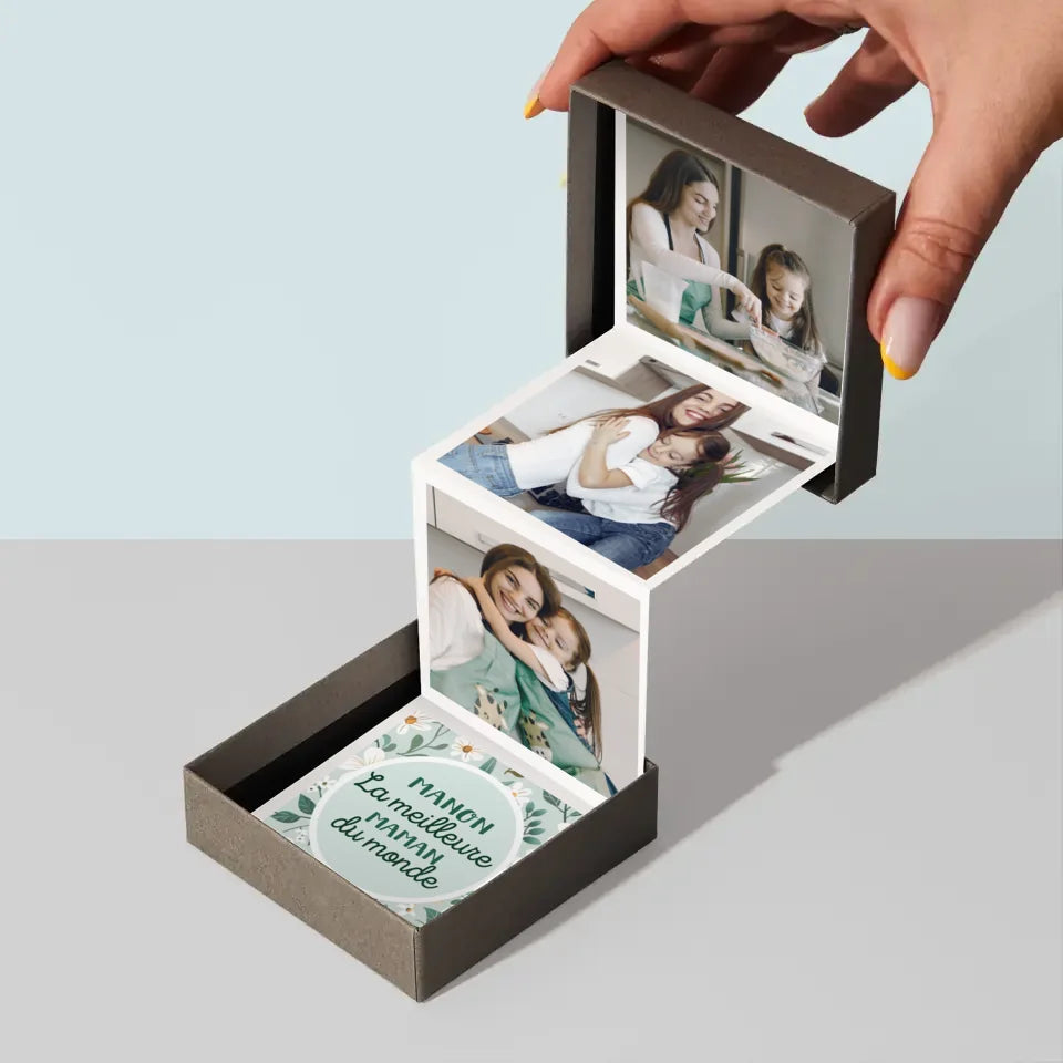 Le complet se compose de trois photos mesurant 6,68 x 6,68 cm et d'une carte personnalisée avec une dédicace au destinataire.