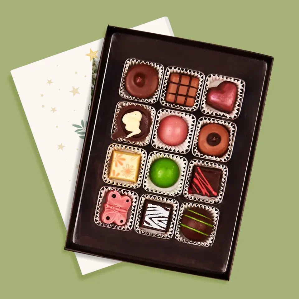 De délicieuses pralines au chocolat belge dans une boîte élégante avec personnalisation de votre choix.