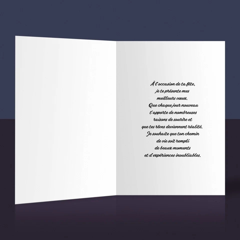 Dimensions de la carte pliée : standard : 13 x 18 cm, version XL : 21 x 29,5 cm.