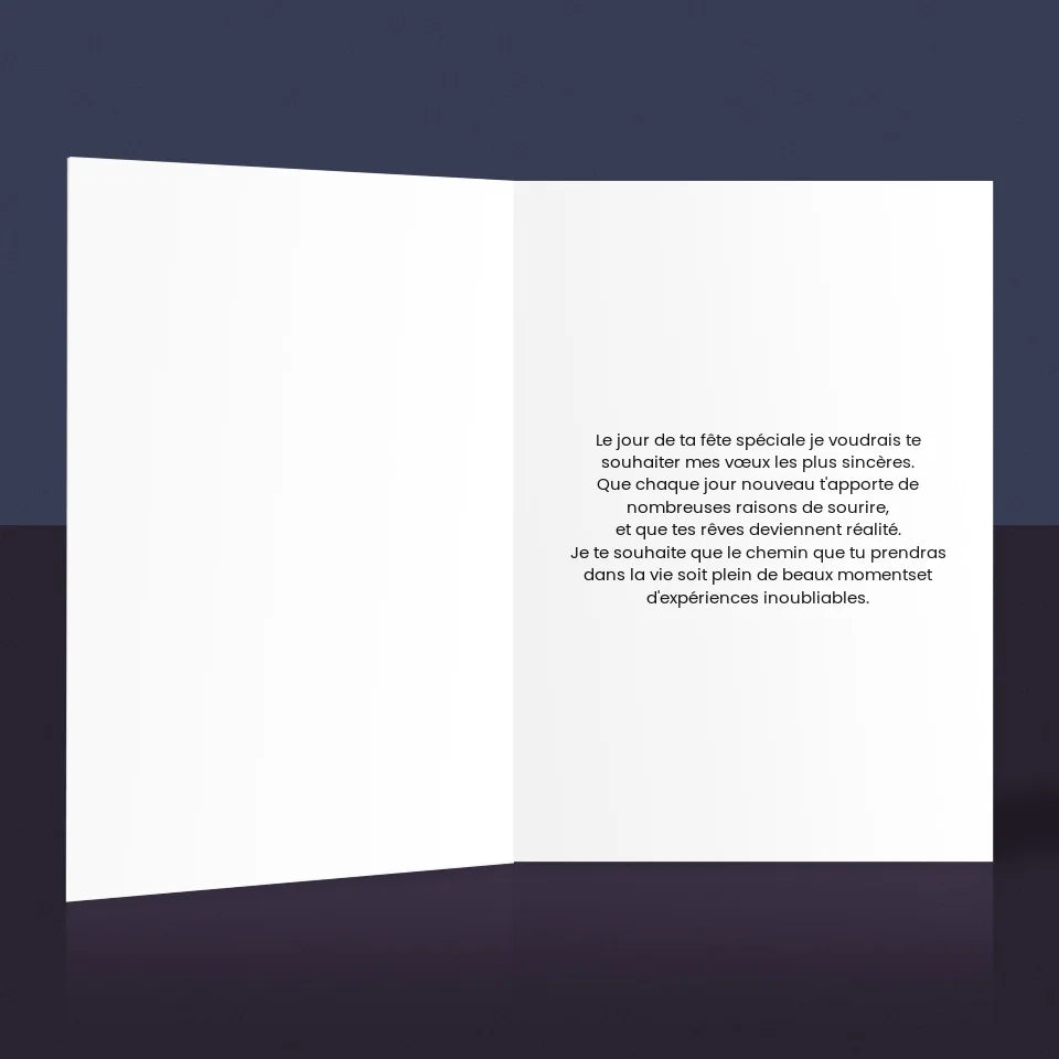 Dimensions de la carte pliée : standard : 13 x 18 cm, version XL : 21 x 29,5 cm.