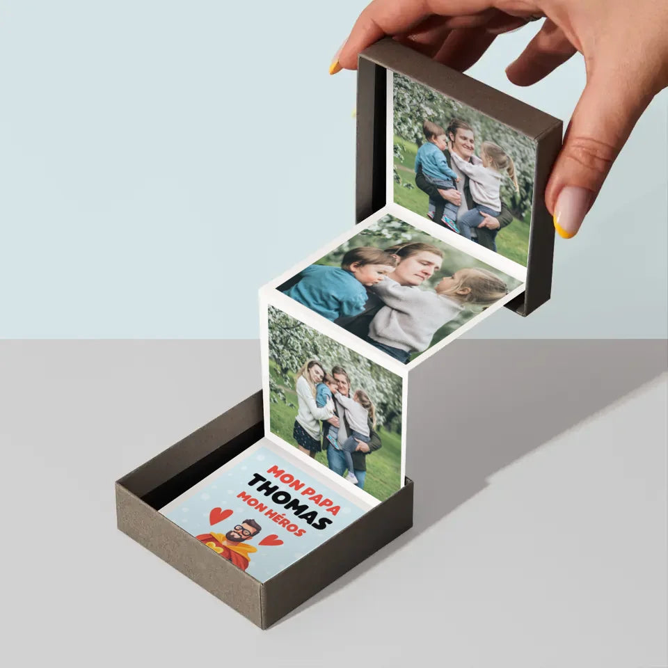 Le complet se compose de trois photos mesurant 6,68 x 6,68 cm et d'une carte personnalisée avec une dédicace au destinataire.