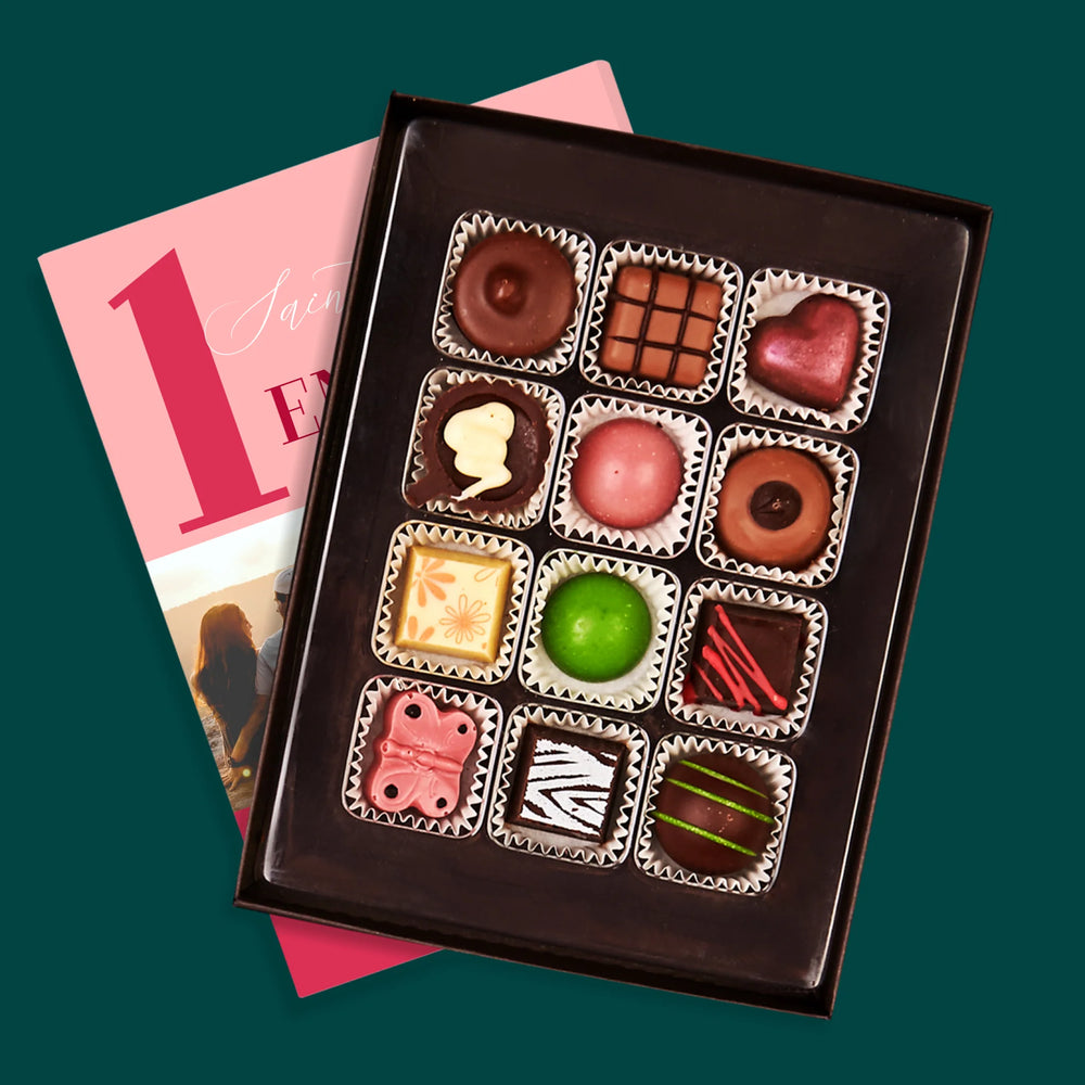 De délicieuses pralines au chocolat belge dans une boîte élégante avec personnalisation de votre choix.