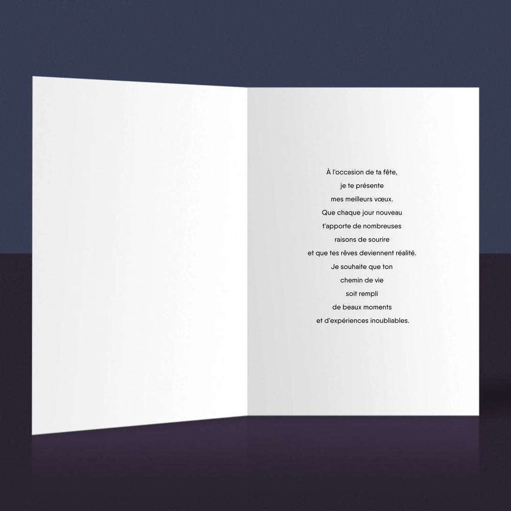 Dimensions de la carte pliée : standard : 13 x 18 cm, version XL : 21 x 29,5 cm.