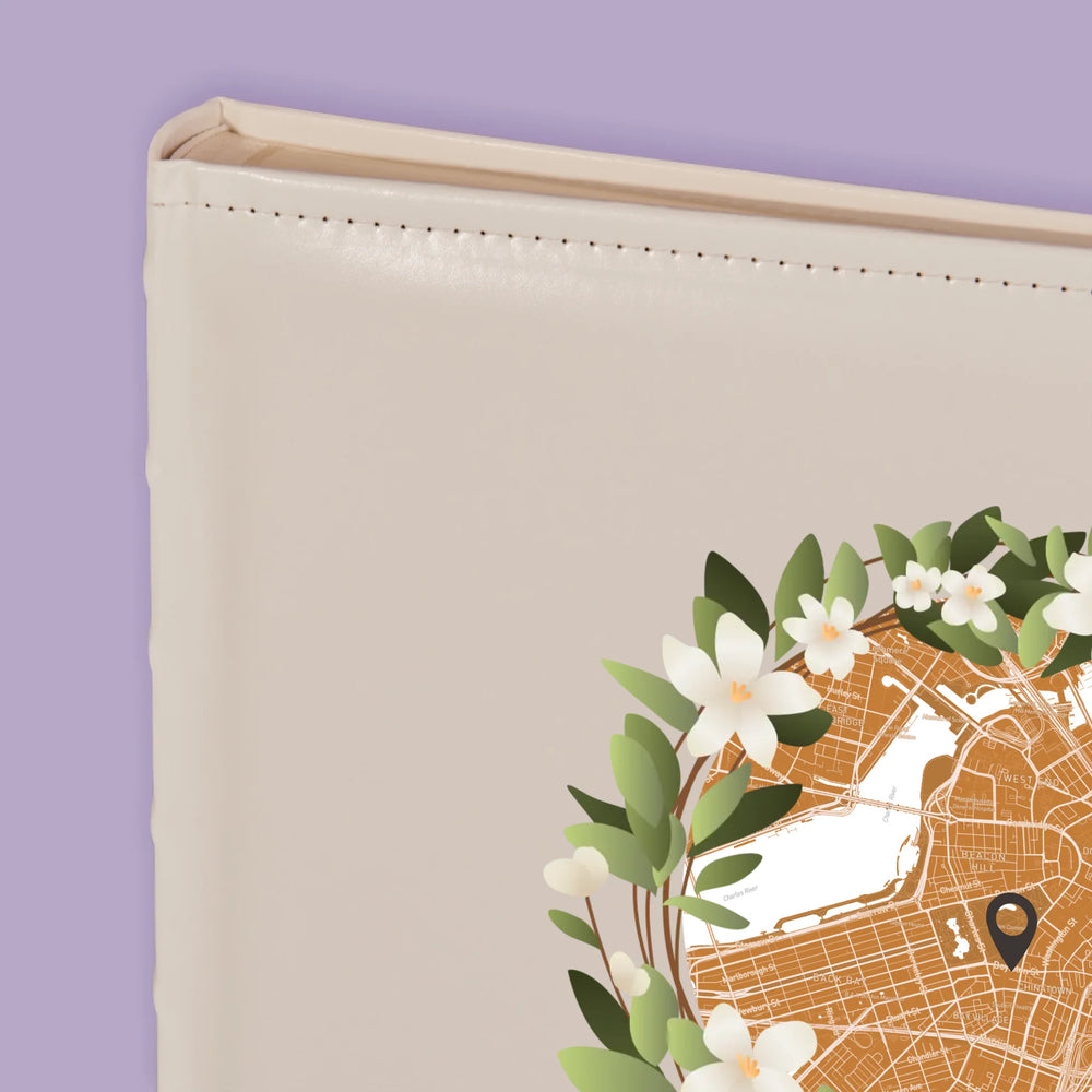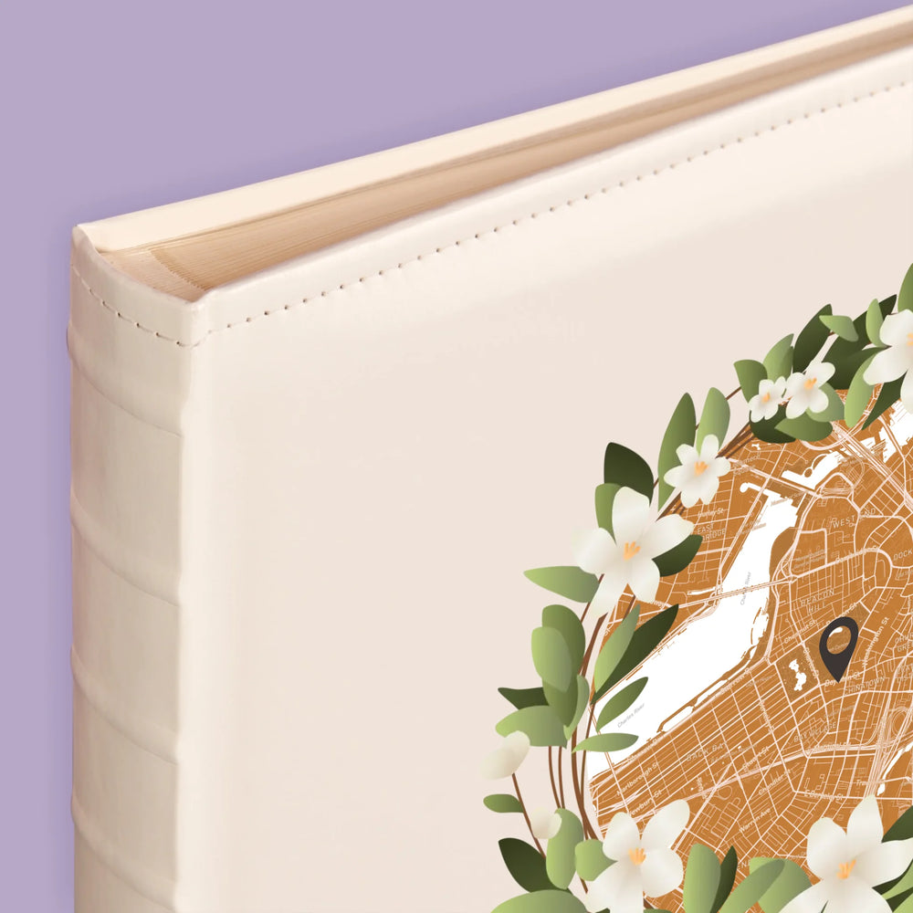 Couverture en cuir écologique, légèrement brillant, en blanc. L'album se compose de 30 cartes (60 pages).