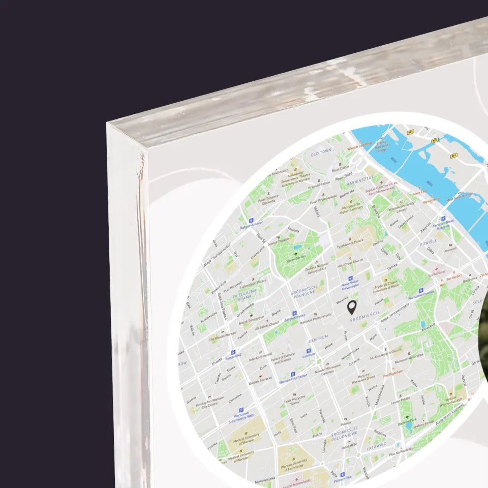Un imprimé sur un bloc d'acrylique transparent (plexiglas) de 2 cm d'épaisseur avec un motif personnalisé de votre choix.