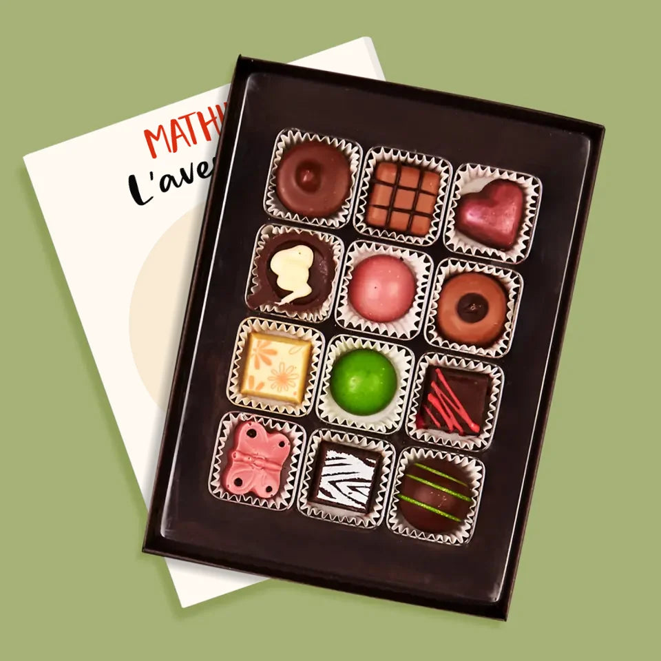 De délicieuses pralines au chocolat belge dans une boîte élégante avec personnalisation de votre choix.
